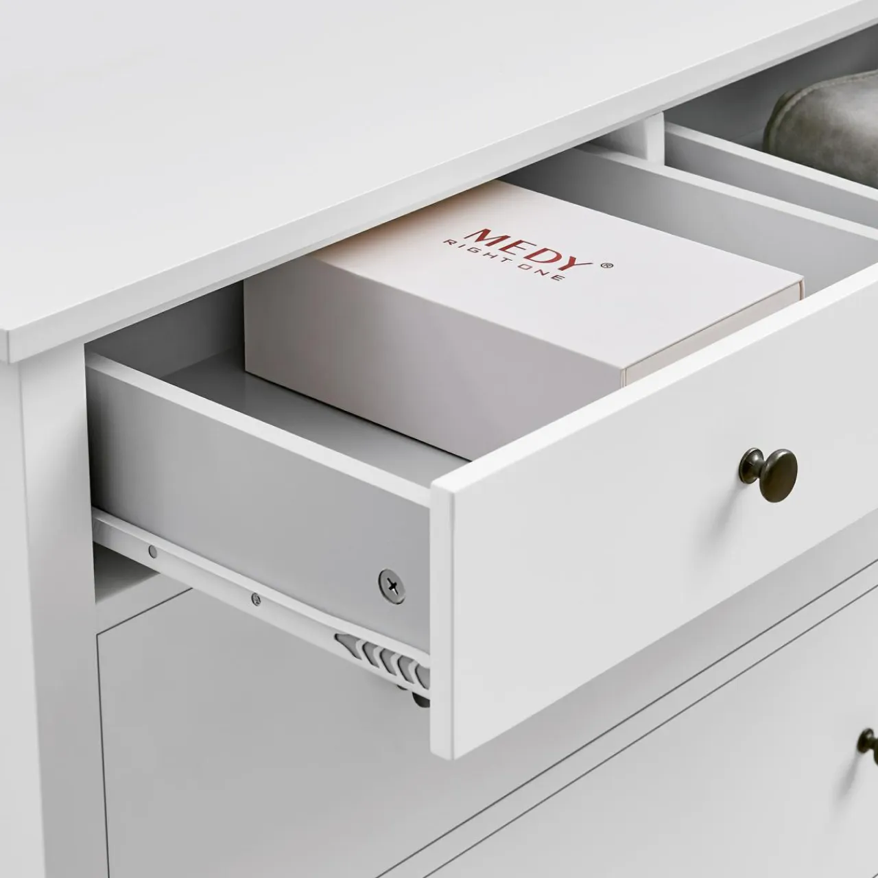 - Pozostałe 3 szuflady wykorzystasz do przechowywania tekstyliów domowych, ubrań i dodatków do stylizacji. Wszystko znajdzie swoje miejsce w osobnej szufladzie.