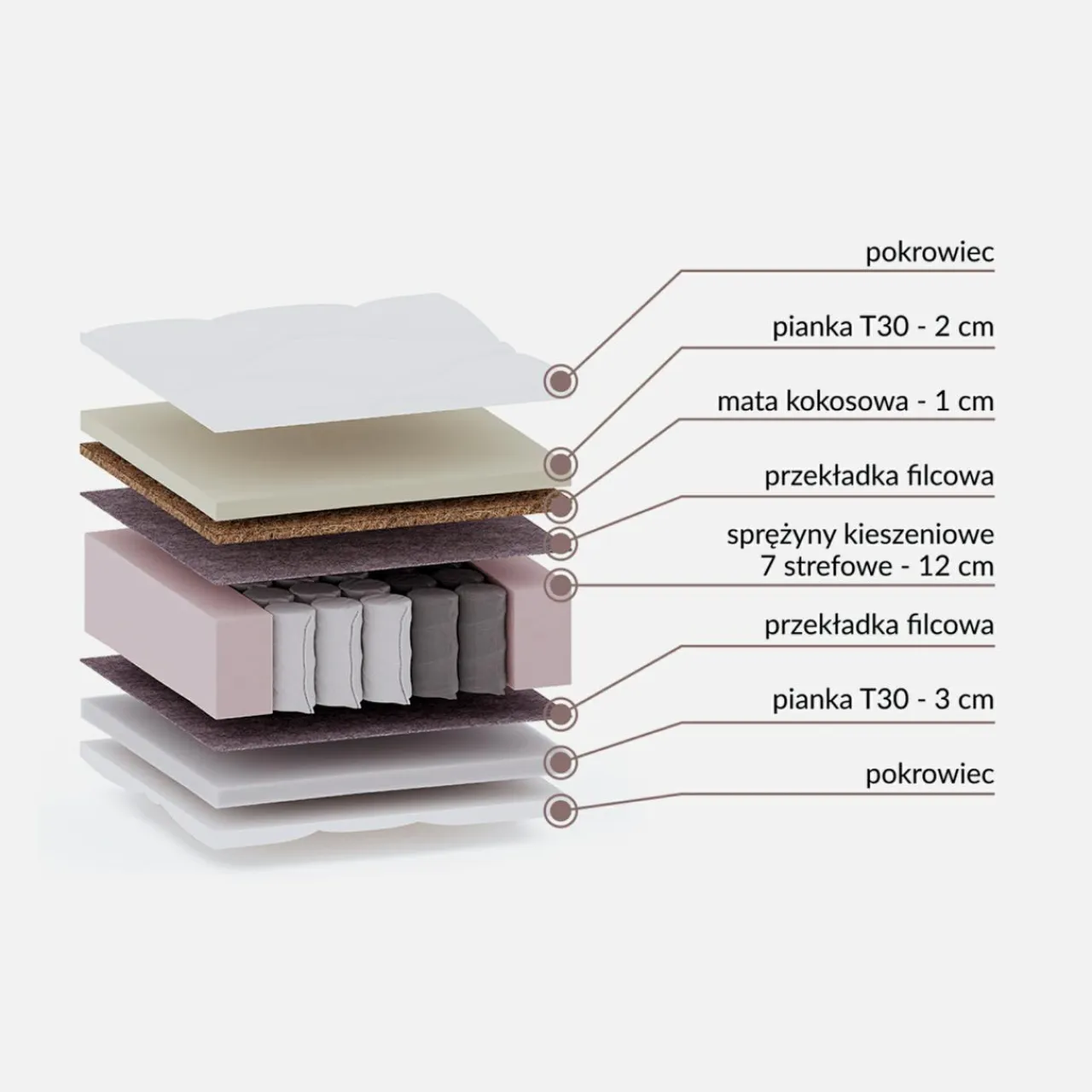 - Materac ze sprężynami kieszeniowymi zapewni idealne dopasowanie do kształtu ciała i komfortowy sen.