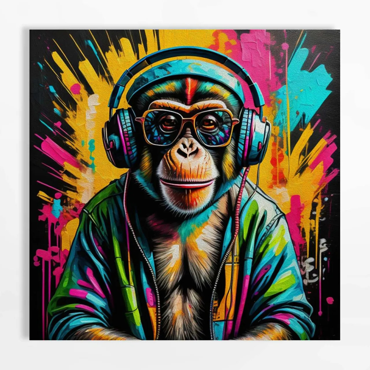 - Małpa w słuchawkach i okularach trafi w gust miłośnika muzyki i kolorowych dekoracji.
