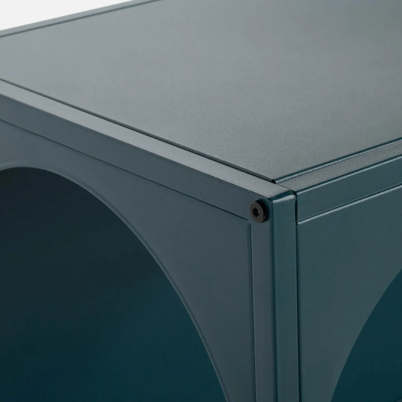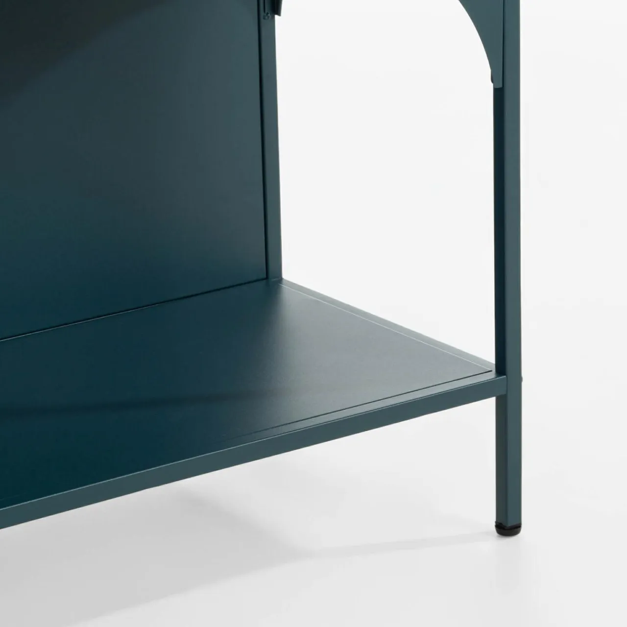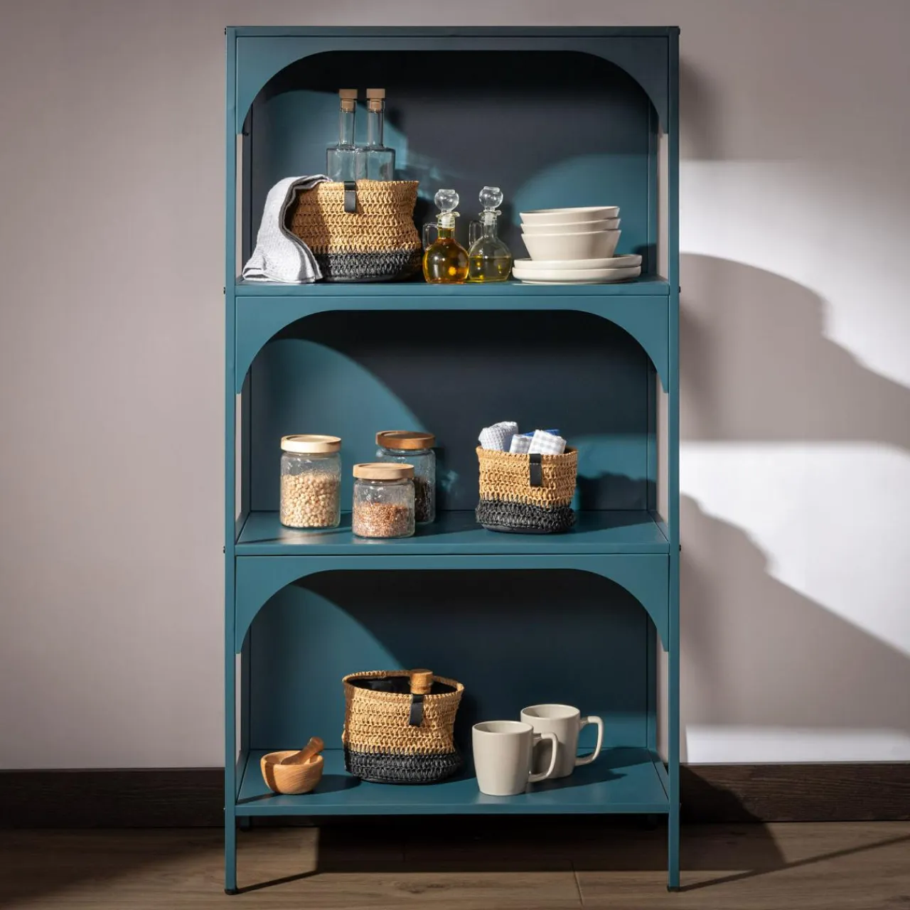 Regał HOCCA w niebieskim kolorze łączy industrialne akcenty z nowoczesnym designem, tworząc elegancką i funkcjonalną przestrzeń do przechowywania.