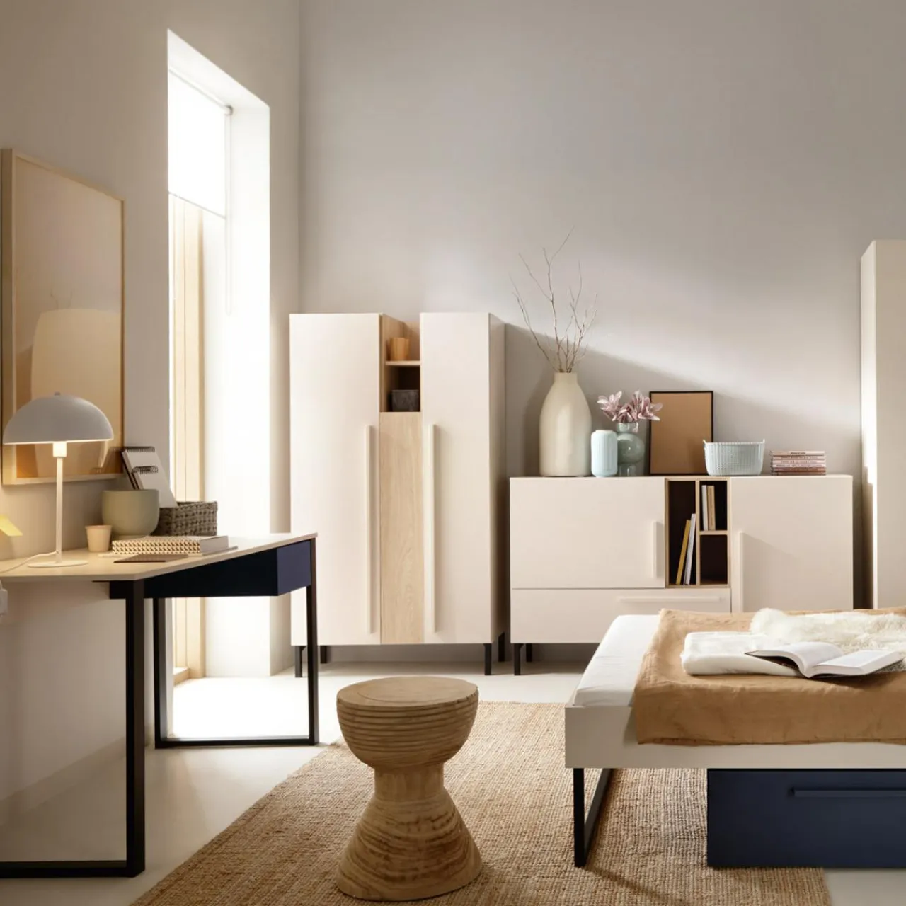 - W kolekcji znajdują się meble w 3 wybarwieniach. Jasny beż piaskowy przełamuje kolor dębu olejowanego i granatu królewskiego. Wyraźne elementy uwydatniają delikatny odcień, podkreślając ciepło i elegancję.