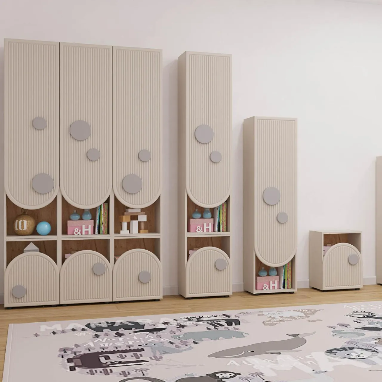- Delikatne ryflowanie i szare elementy dekoracyjne świetnie wpiszą się w nowoczesne wnętrze, a także podkreślą dziecięcą kreatywność.