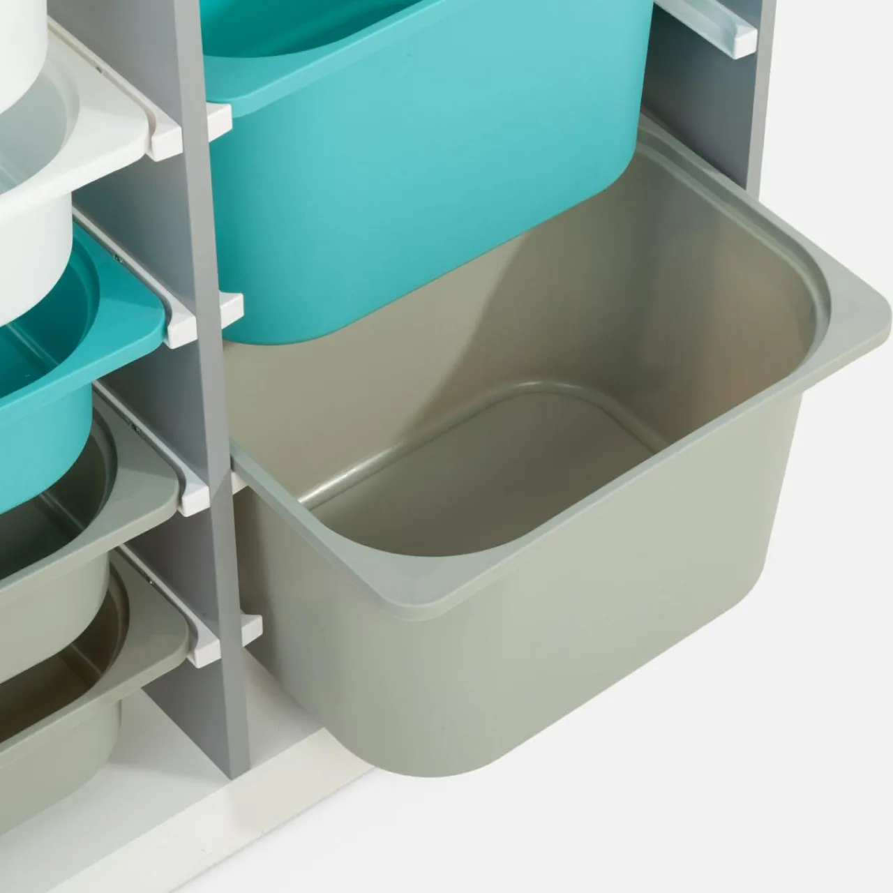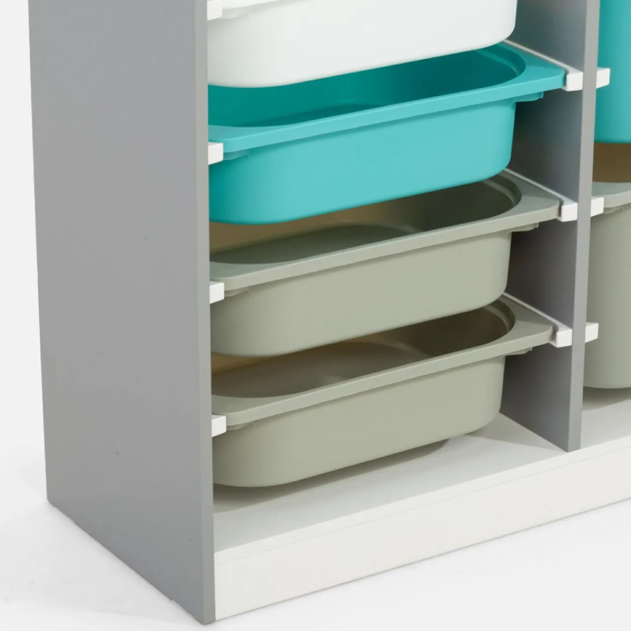 - Regał zawiera pojemniki do przechowywania w 2 rozmiarach, zawieszone na szynach. Dzięki temu pod Twoim okiem dziecko będzie mogło uczyć się organizacji przestrzeni i decydować o przeznaczeniu każdej z szuflad.
