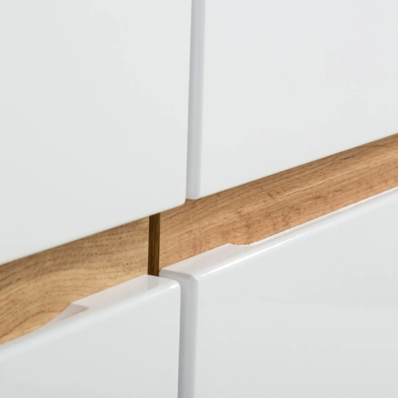 - Fronty mebli wykończone są w białym połysku. Gładka, lśniąca tafla optycznie powiększy pomieszczenie.