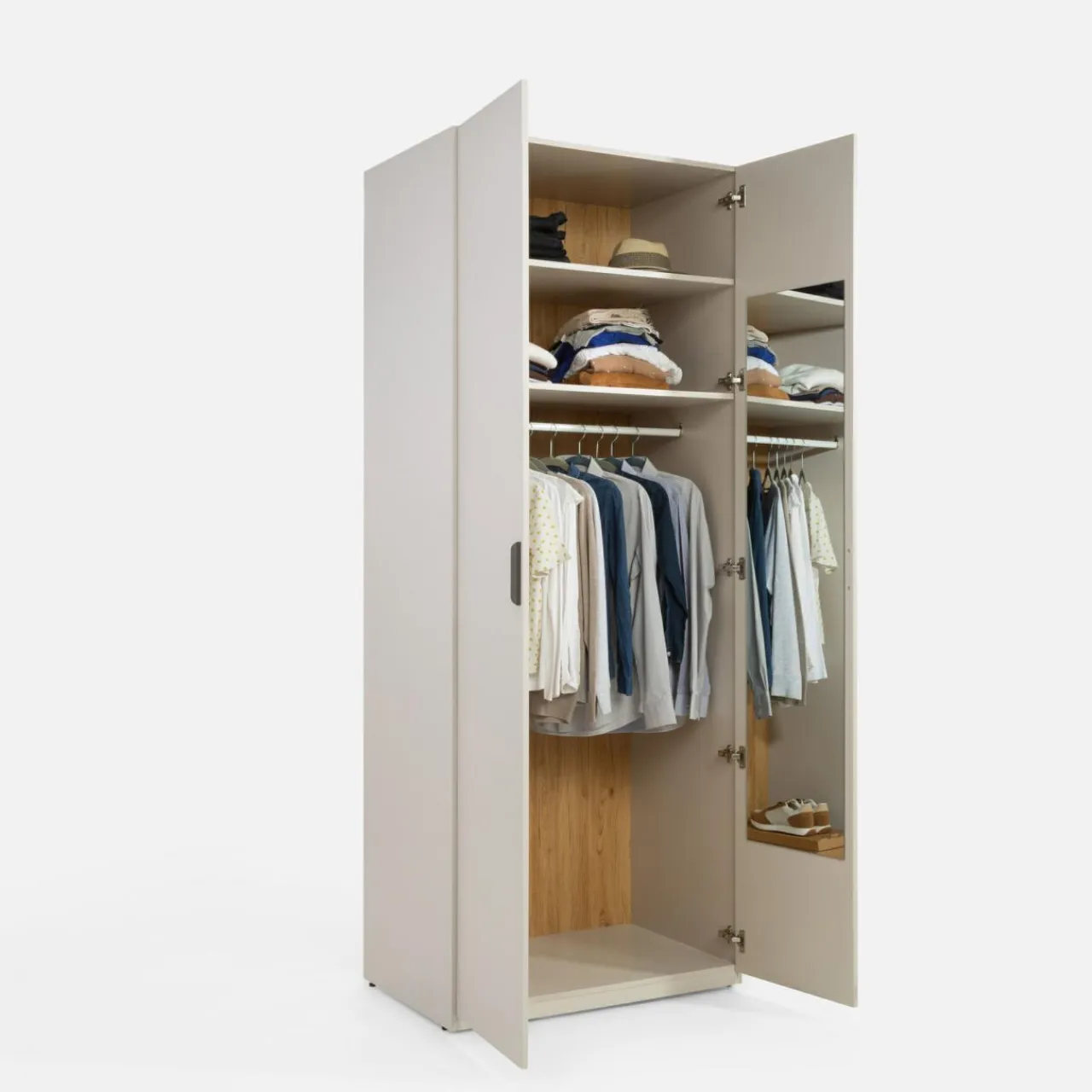 Szafa MAX MODERN II posiada lustro wewnętrzne — przy wyborze kreacji przejrzysz się w gładkiej tafli bez zamykania drzwi!
