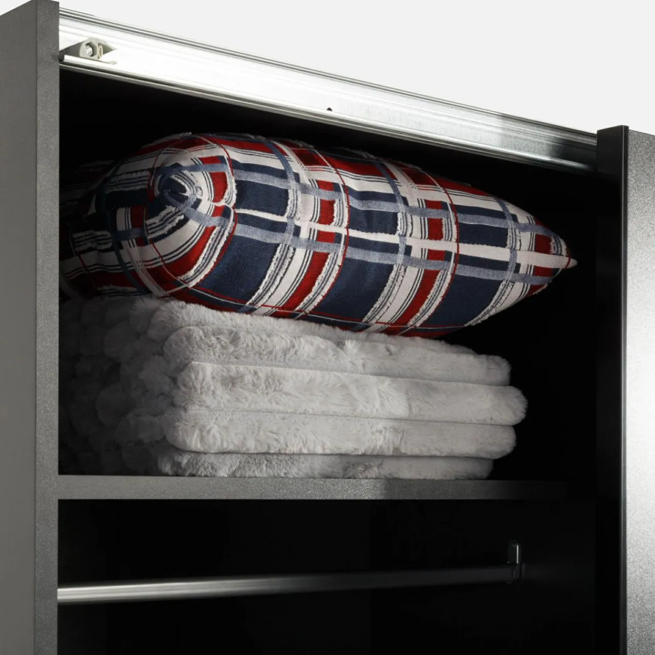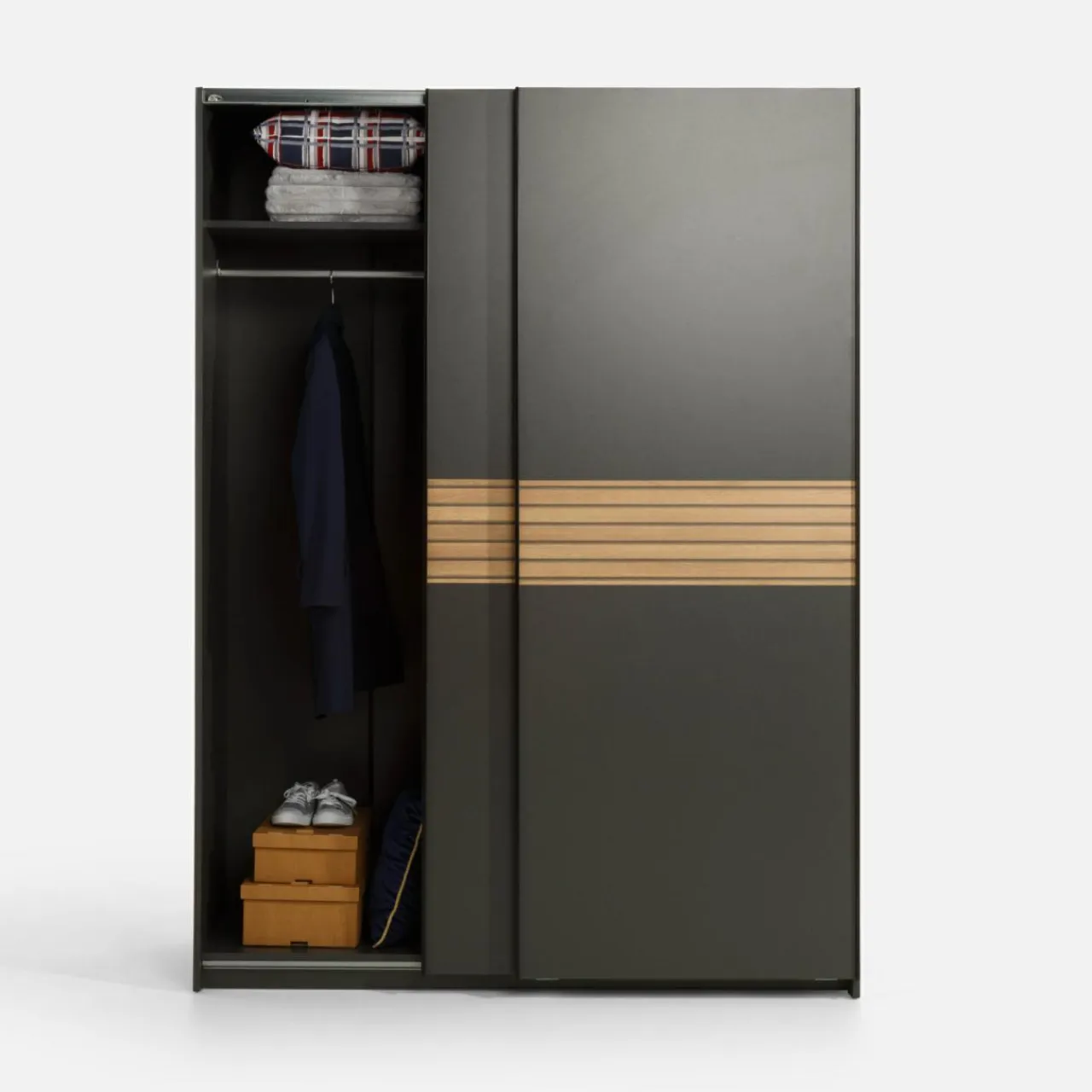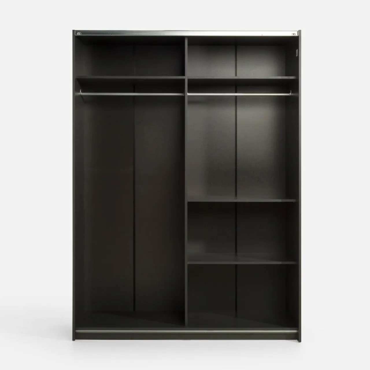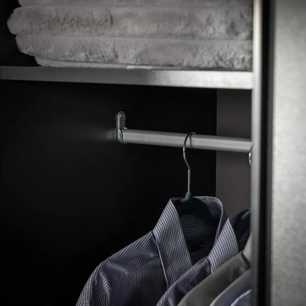 Szafa METROPOLITAN posiada w środku 2 drążki na ubrania oraz 4 półki. Dzięki takiemu układowi oddzielisz swoją odzież od partnera lub sezonową od aktualnie noszonej.