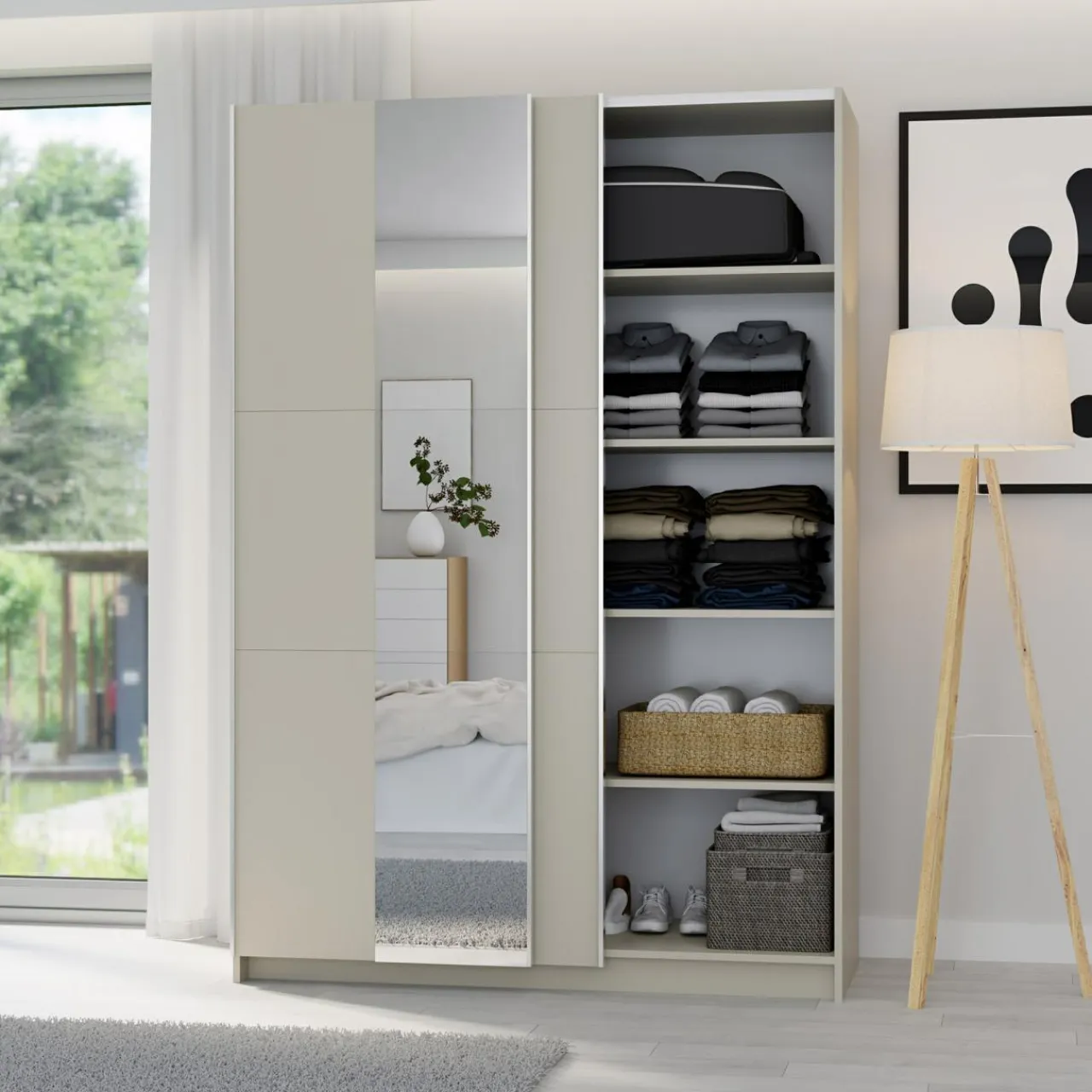 Szafa z lustrem LUSE to propozycja dla miłośników nowoczesnych wnętrz i praktycznych rozwiązań. Oferuje idealną przestrzeń do przechowywania, jednocześnie nie zajmując zbyt dużo miejsca w pomieszczeniu. Jej wykończenie w kolorze kaszmir nada wnętrzu ciepła i wyjątkowego charakteru. Lustro w centralnej części frontu powiększy optycznie przestrzeń, nadając jej lekkości i jasności.