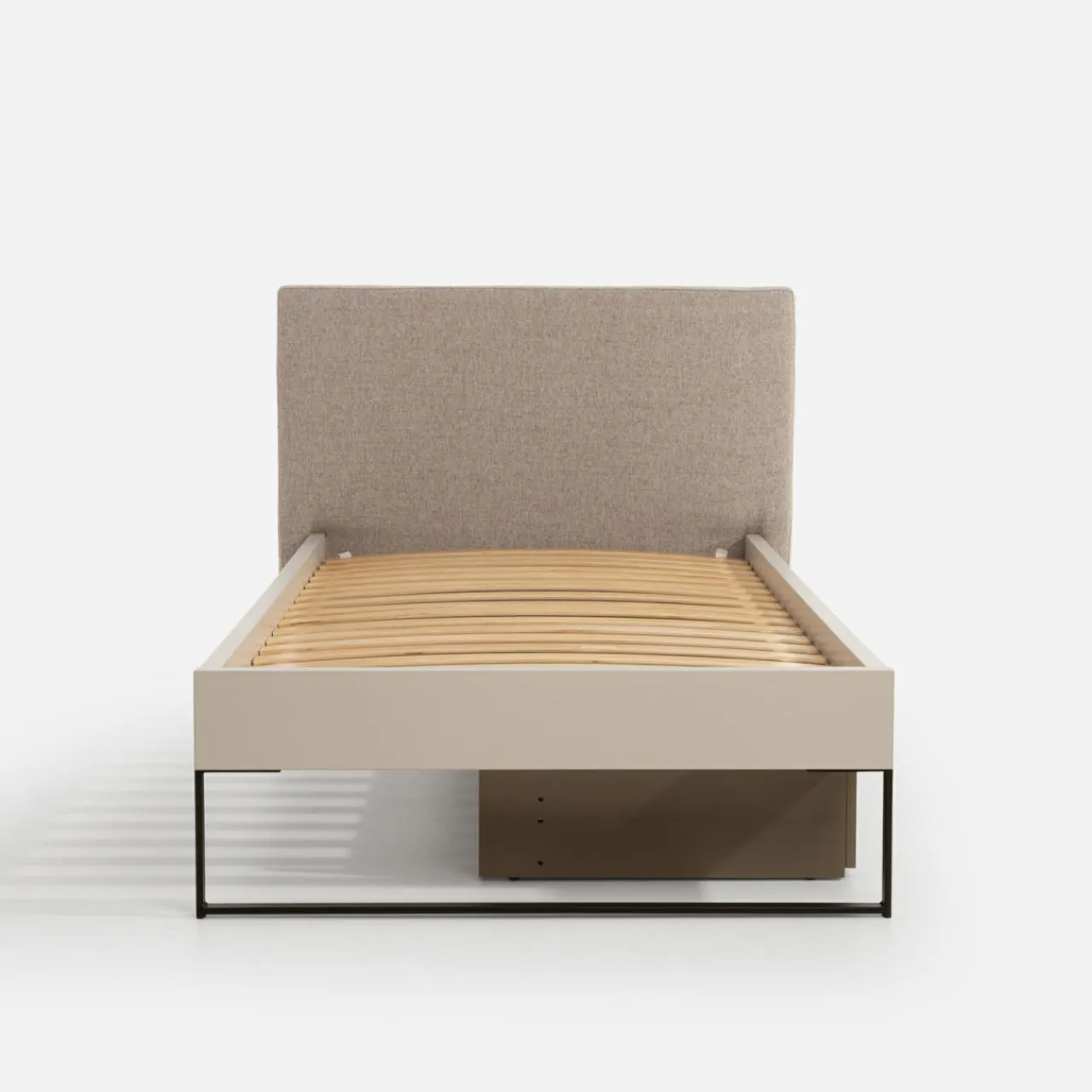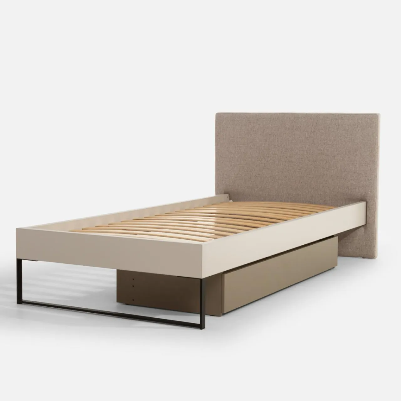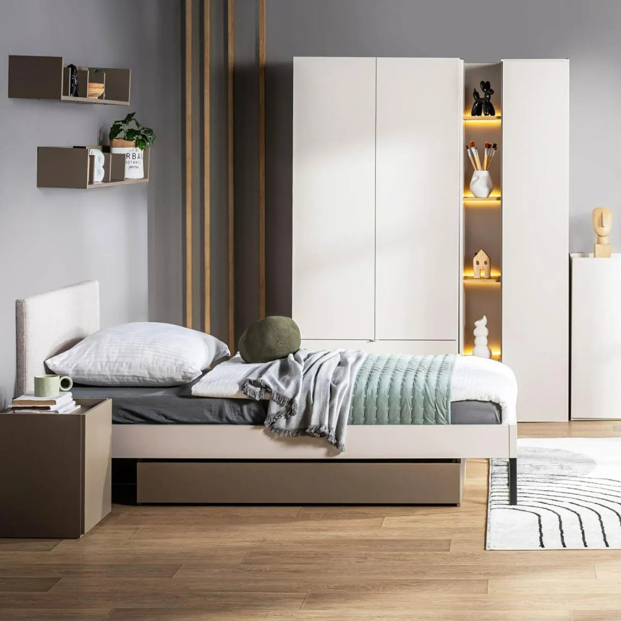 Stwórz przytulną sypialnię z łóżkiem SIGMA. Gładkie beżowe i truflowe powierzchnie harmonijnie łączą się z tapicerowanym wezgłowiem. Sypialnie zyskuje przytulny i ciepły klimat.