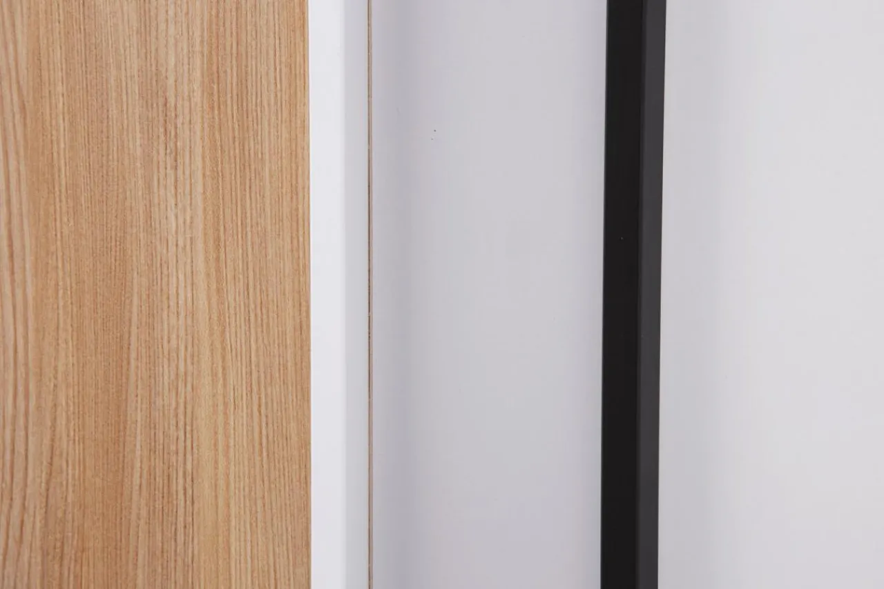 - Połączenie 3 kolorów to mieszanka koloru szarego przypominającego surowy beton, bieli oraz dębu.