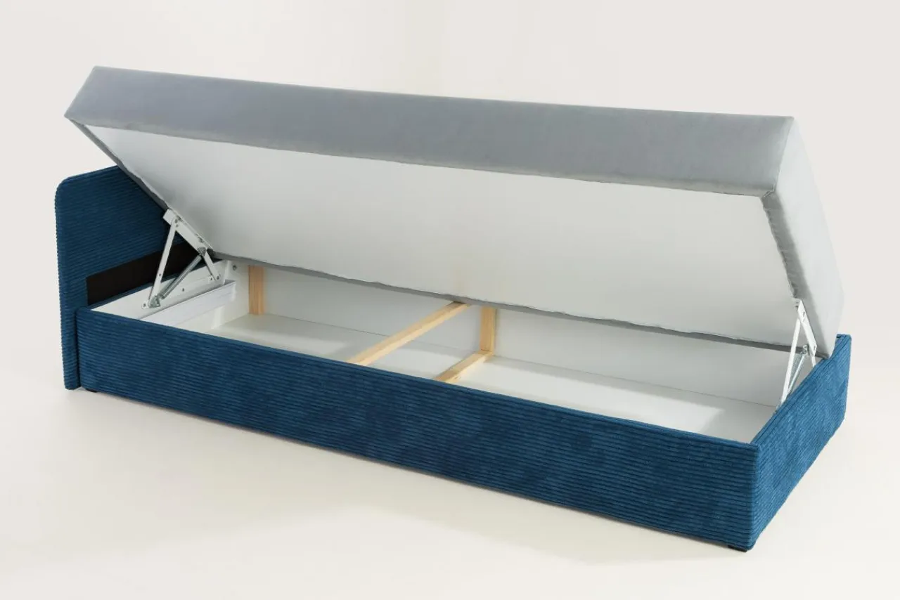 - Tapczan OPEN posiada pod siedziskiem pojemnik na pościel, do którego możesz schować poduszkę, pościel i prześcieradło.