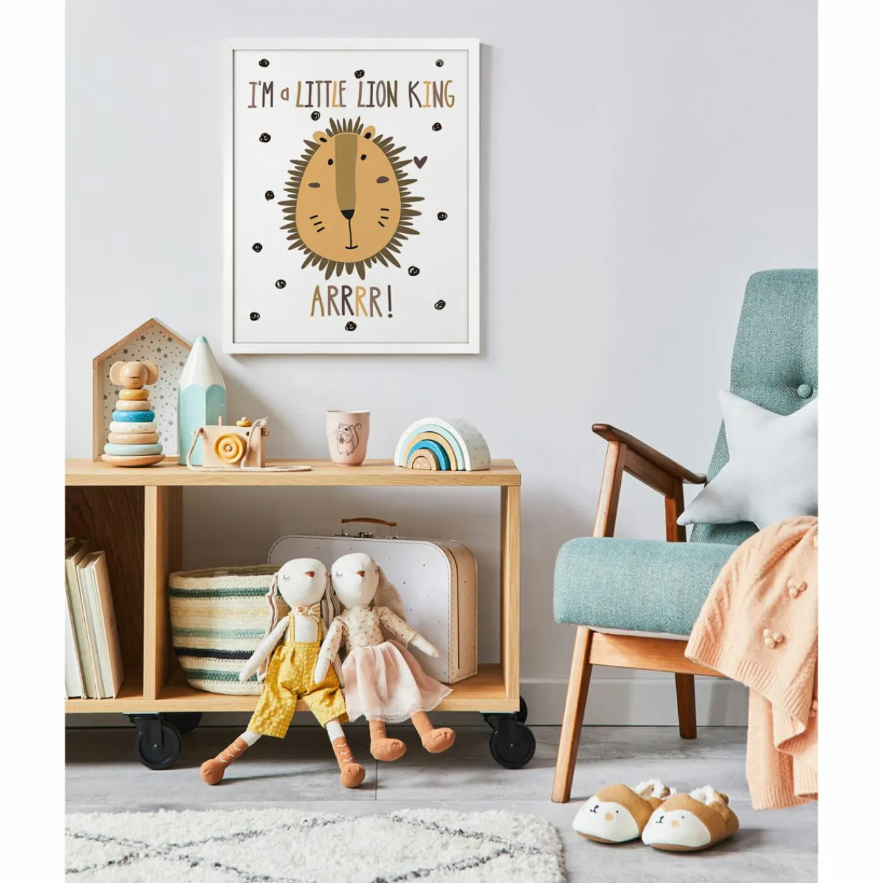 Obraz dla dziecka LION o wymiarach 40×50 cm będzie ładnie wyglądał przy jasnych lub drewnianych meblach. Możesz go też powiesić nad stoliczkiem, przy którym Twoje dziecko lubi się bawić. Obraz z uśmiechniętym lwem pomoże stworzyć przytulną atmosferę.