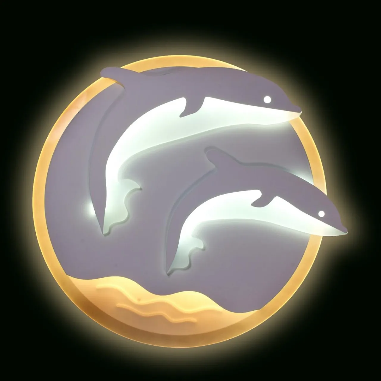 - okrągły plafon przedstawia delfiny wyskakujące z fal oceanu