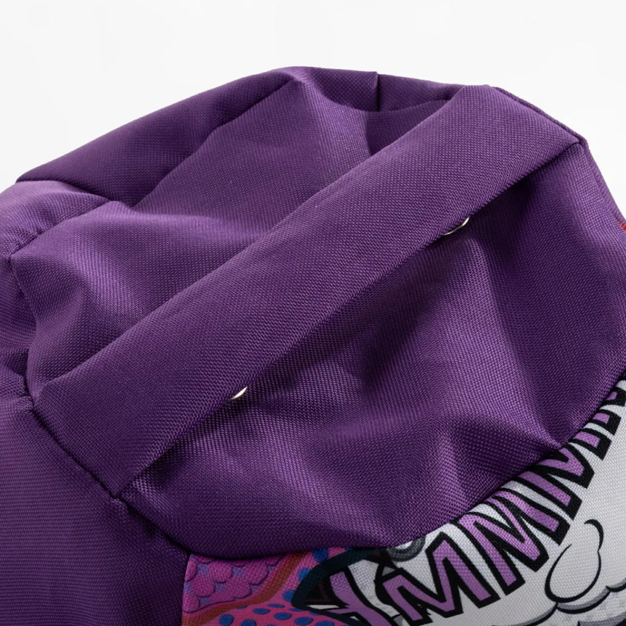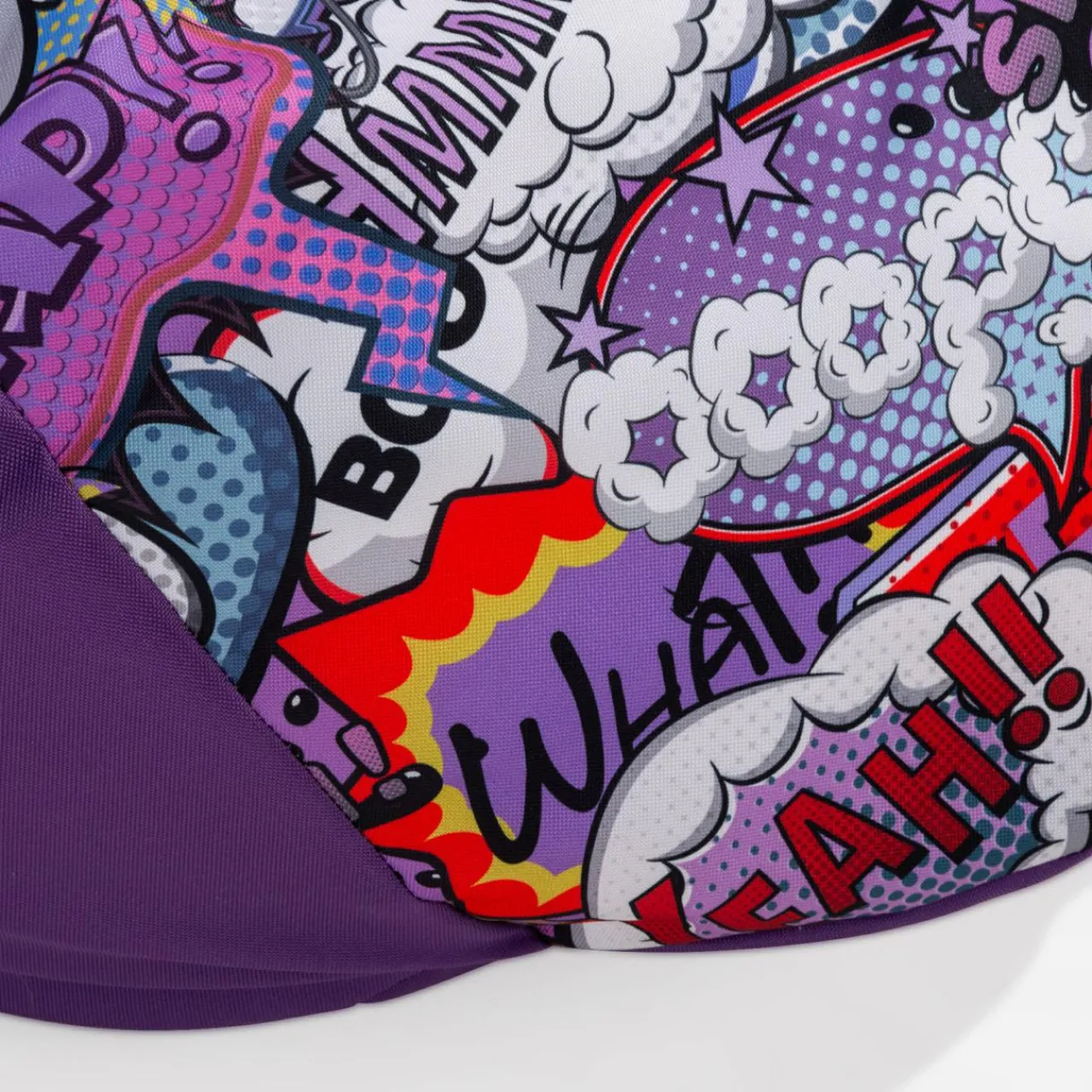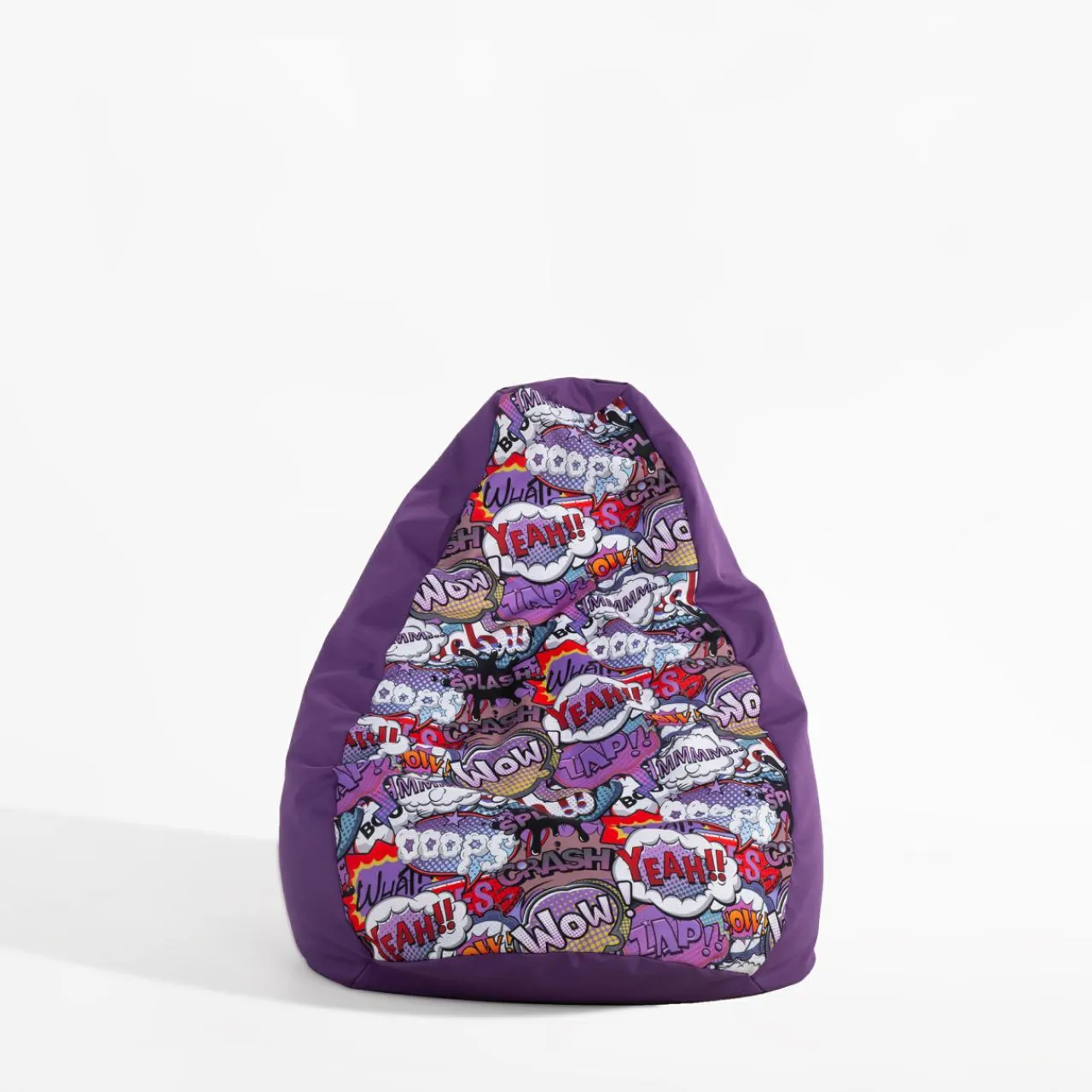 Fioletowy puf z komiksowym wzorem zapewni efekt „wow” w aranżacji pokoju nastolatka.