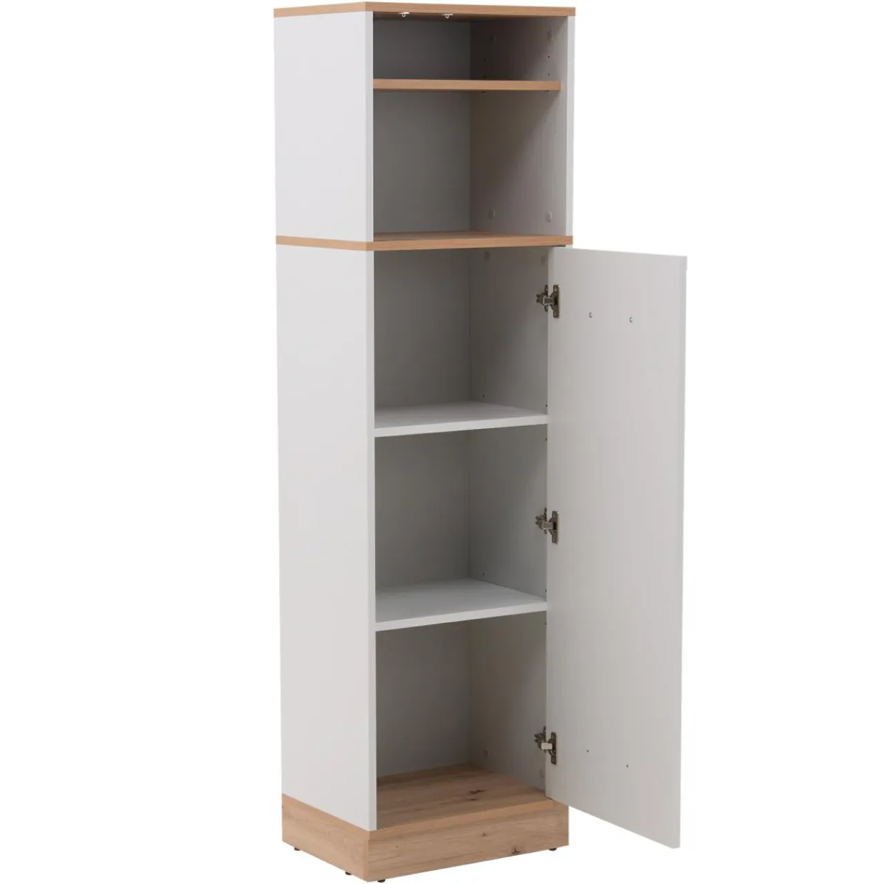 Dzięki zamykanej szafce i otwartej półce zapewnia zarówno funkcjonalność, jak i wyeksponowania ulubionych rzeczy.