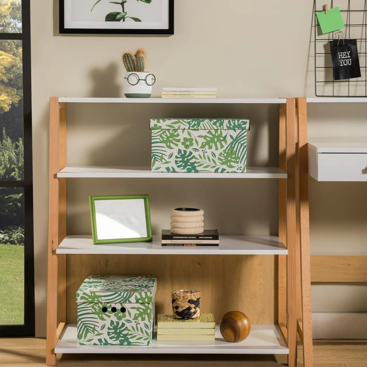 - Półki są zaprojektowane w formie drabinki. Każda półka posiada inną głębokość, zmniejszającą się ku górze.