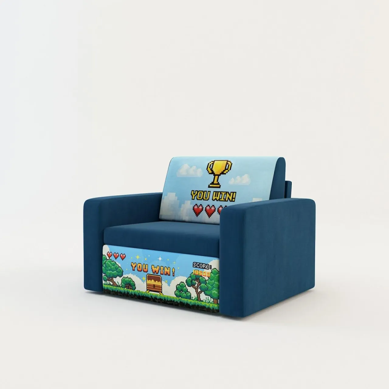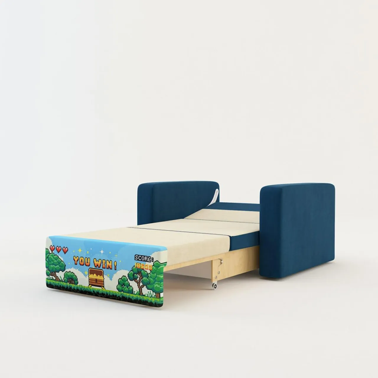 Sofa GAME będzie zarówno przytulnym miejscem do odpoczynku, jak i do spania. Gamingowy motyw dopełni wystrój dziecięcego pokoju.