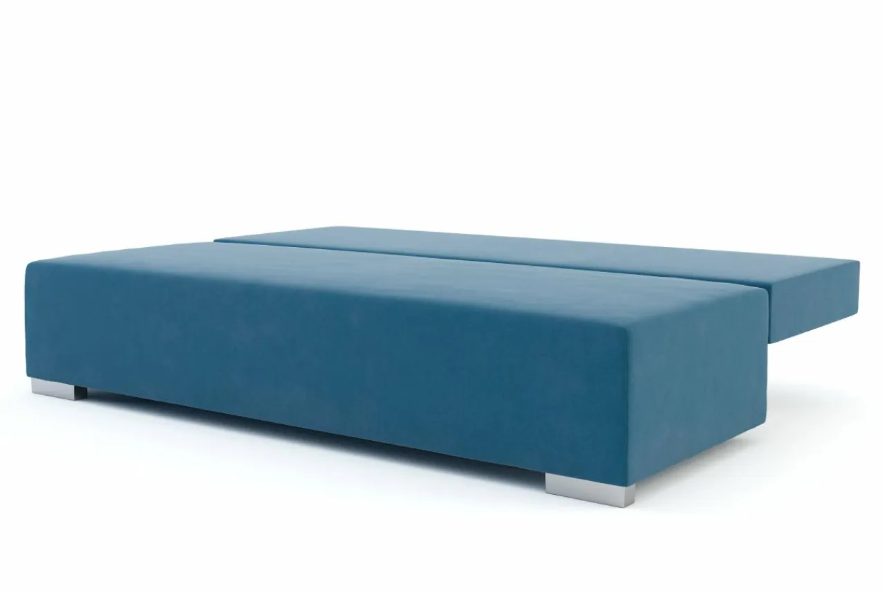 Sofa obita jest welurową, miłą w dotyku tkaniną SWING w niebieskim kolorze. Nowoczesnego wyglądu dodają jej chromowane, poziome nóżki.