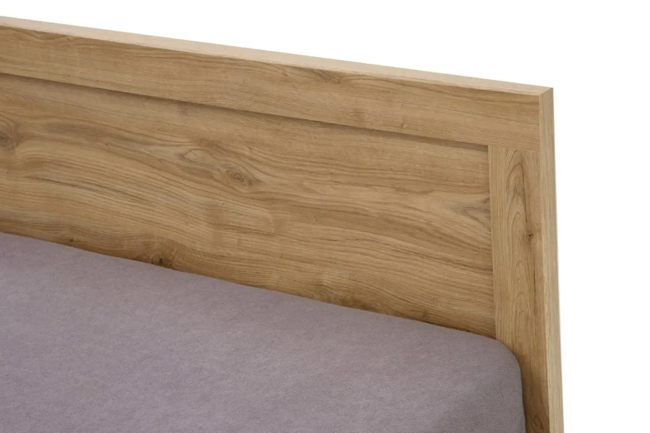 - Korpus i rama łóżka wykonane są z płyty meblowej w kolorze jasnego drewna.