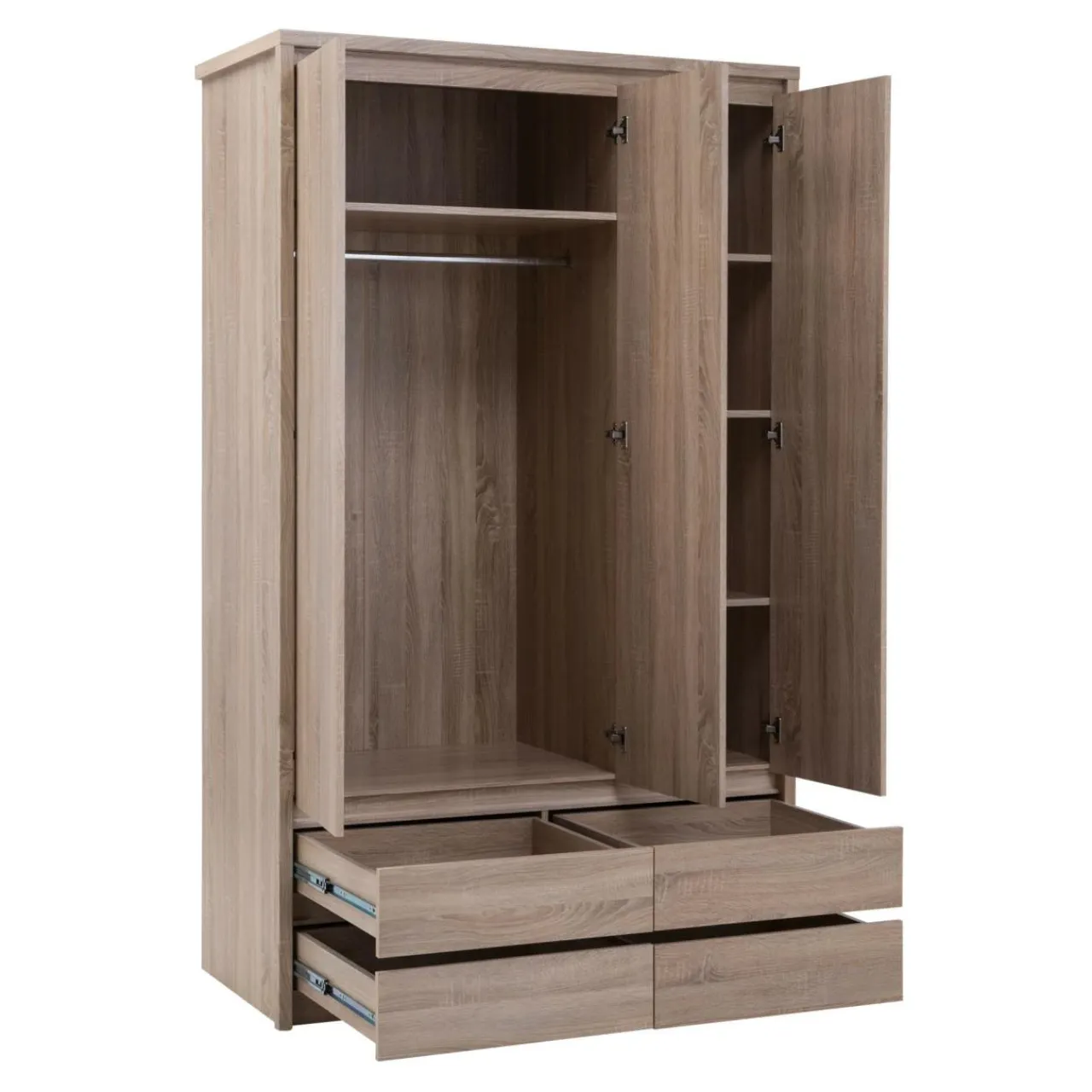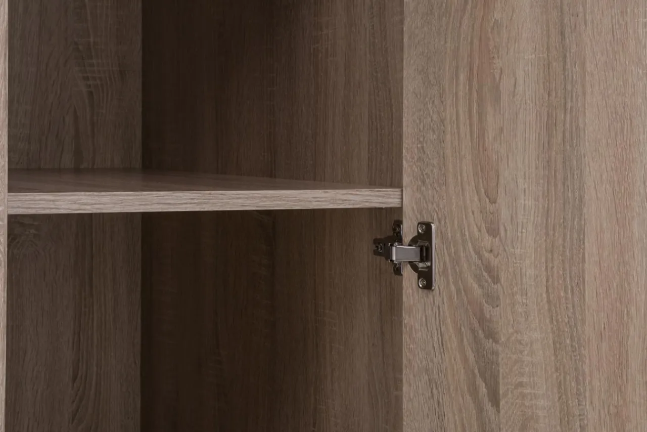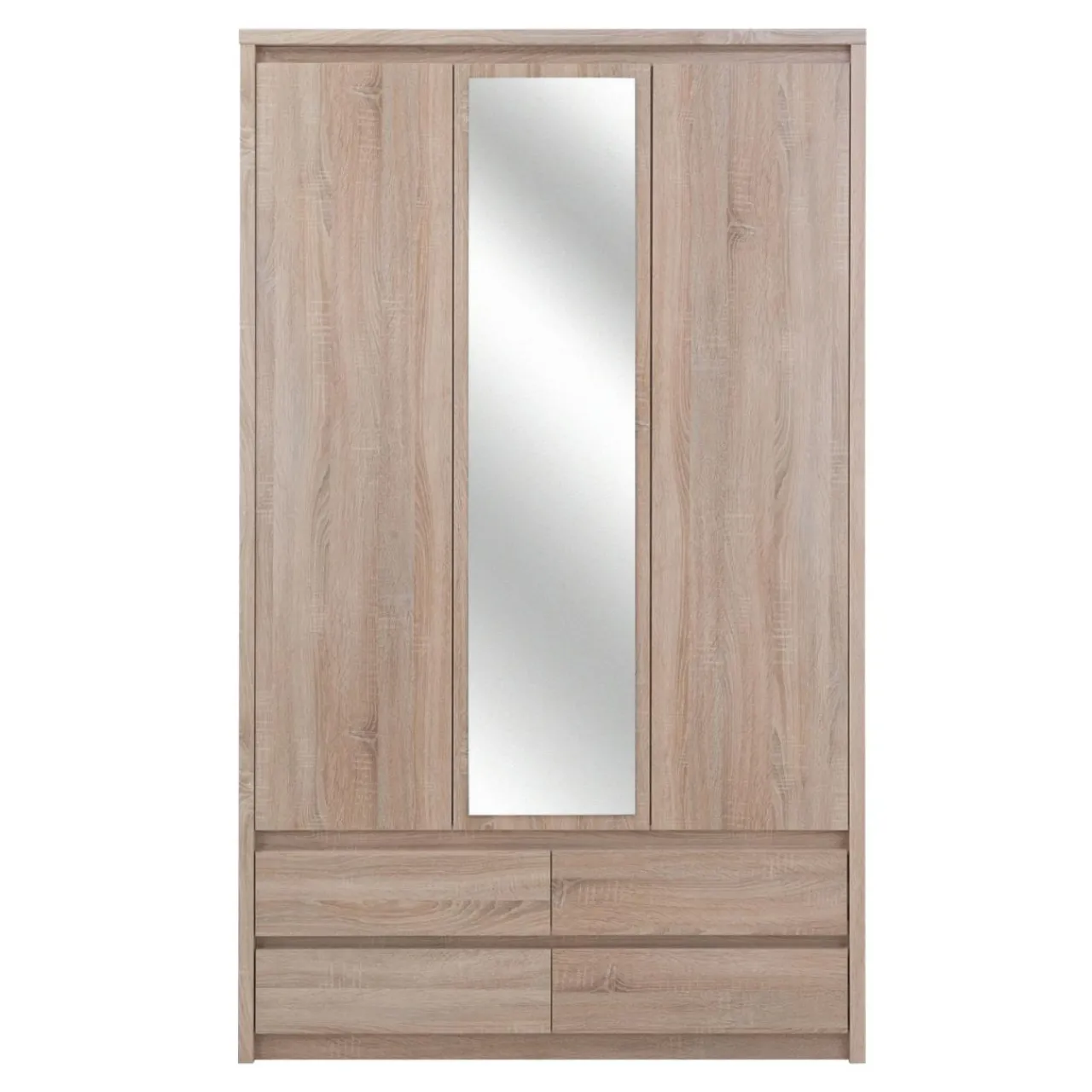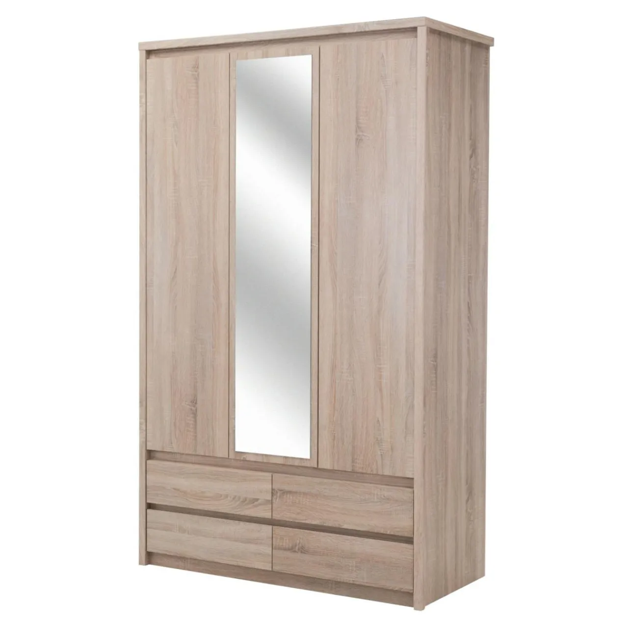 Trzydrzwiowa szafa z lustrem Norton charakteryzuje się prostą minimalistyczną formą, która sprawia, że mebel pasuje do nowoczesnych wnętrz. Laminat w jasnym kolorze dębu sonoma dekorem przypominający drewno wprowadzi w pomieszczeniu przytulny klimat. Brak tradycyjnych uchwytów sprawia, że mebel łatwiej wkomponować w dowolną aranżację.