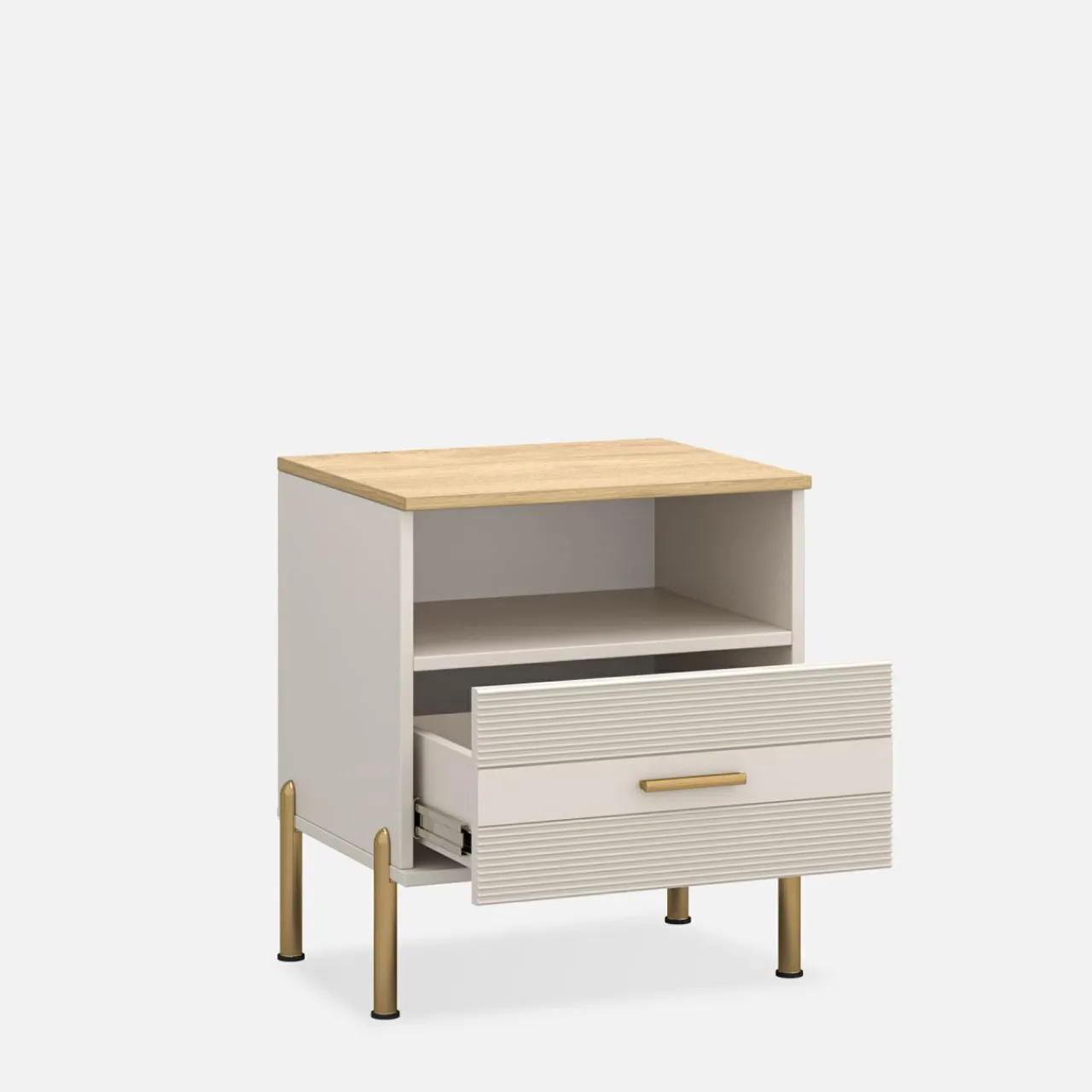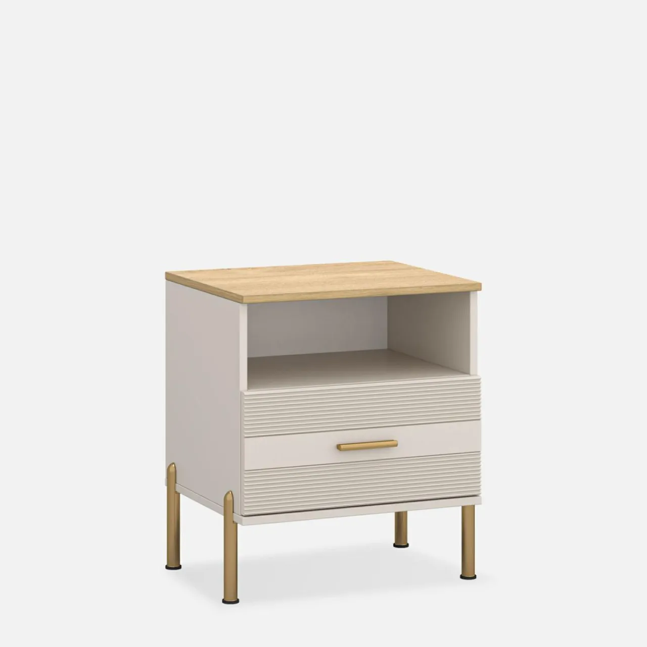 Postaw szafkę nocną RUBEN blisko łóżka. Wysoka — 58 cm — sprawi, że wszystkie przedmioty będą w zasięgu ręki.