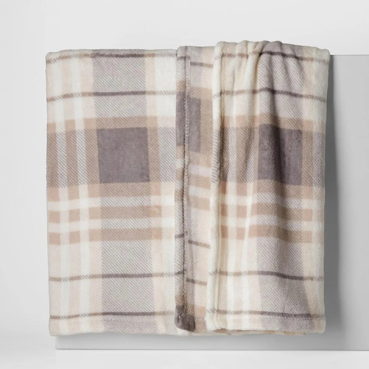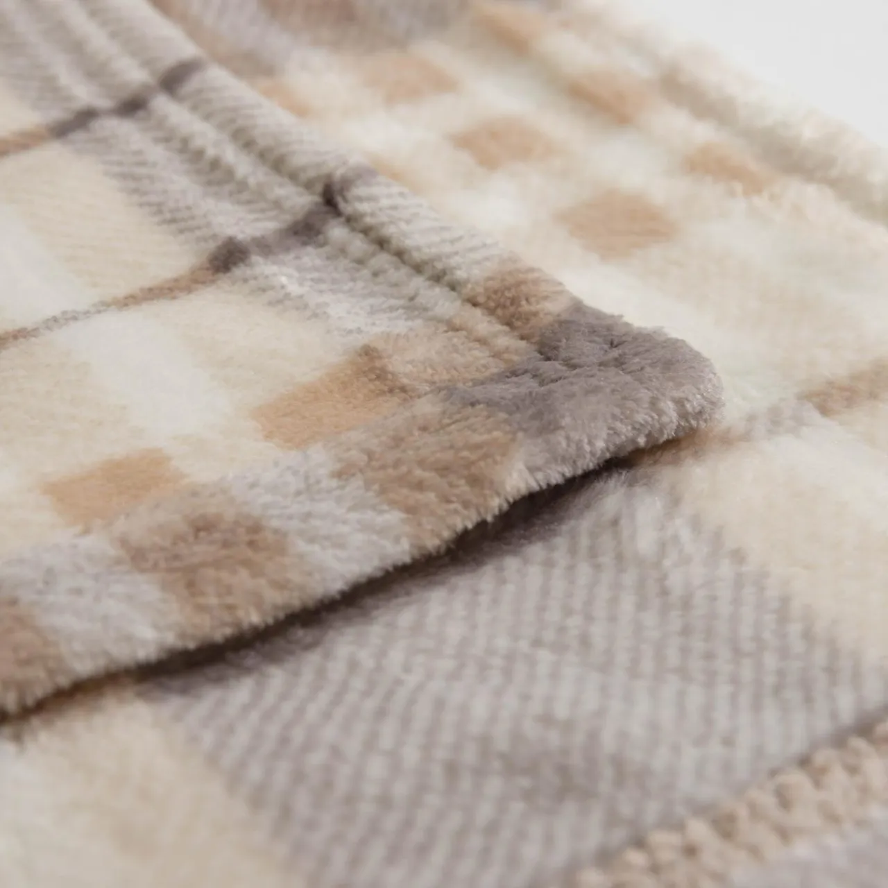 Wzór w szkocką kratę będzie pasować do wielu aranżacji. Beż będzie spójnie wyglądać na tle jasnej sofy.