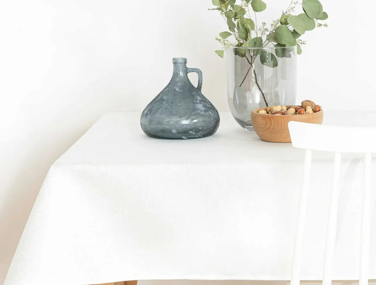 Udekoruj swój stół w jadalni białym obrusem, który ma połyskującą strukturę materiału.
