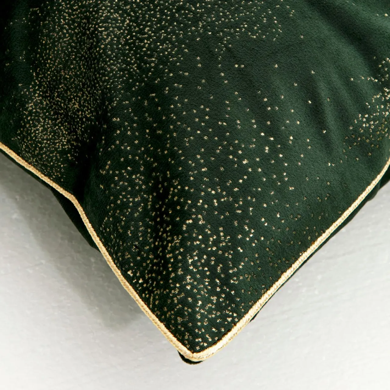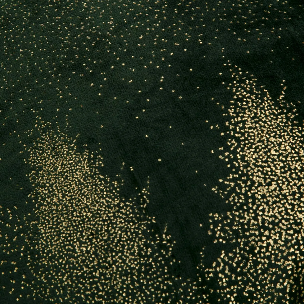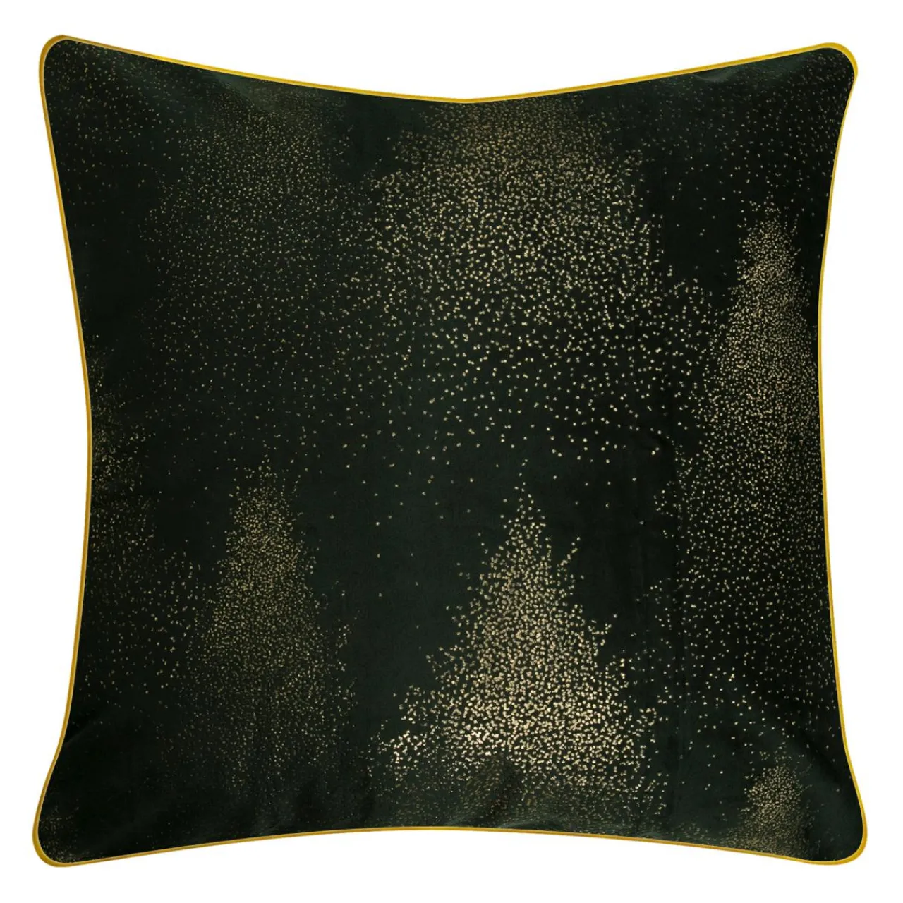 Ciemno zielona poszewka ozdobiona brokatowym nadrukiem lasu będzie pasować do Twojego salonu na co dzień i od święta.