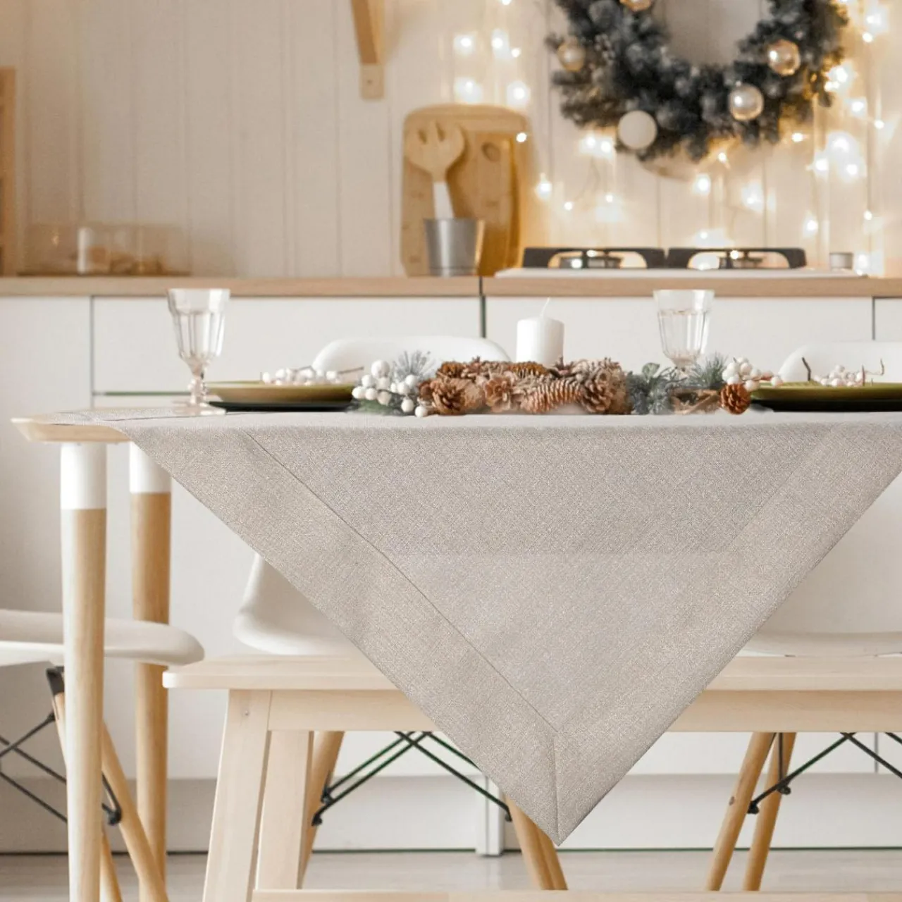 Potrzebujesz zmiany w aranżacji jadalni? Obrus LANA beżowo-srebrnym kolorze jest uszyty z wytrzymałego i odpornego materiału. Podkreśli szykowne i eleganckie wnętrze.