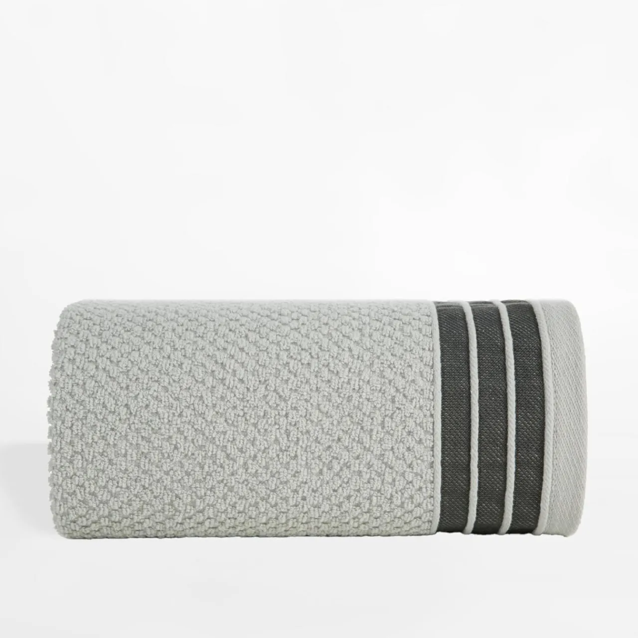 Srebrny ręcznik z kolekcji MADLEN wpisze się w nowoczesną aranżację łazienki. Ryżowa struktura w połączeniu z ozdobną bordiurą nadaje mu elegancki i oryginalny wygląd.