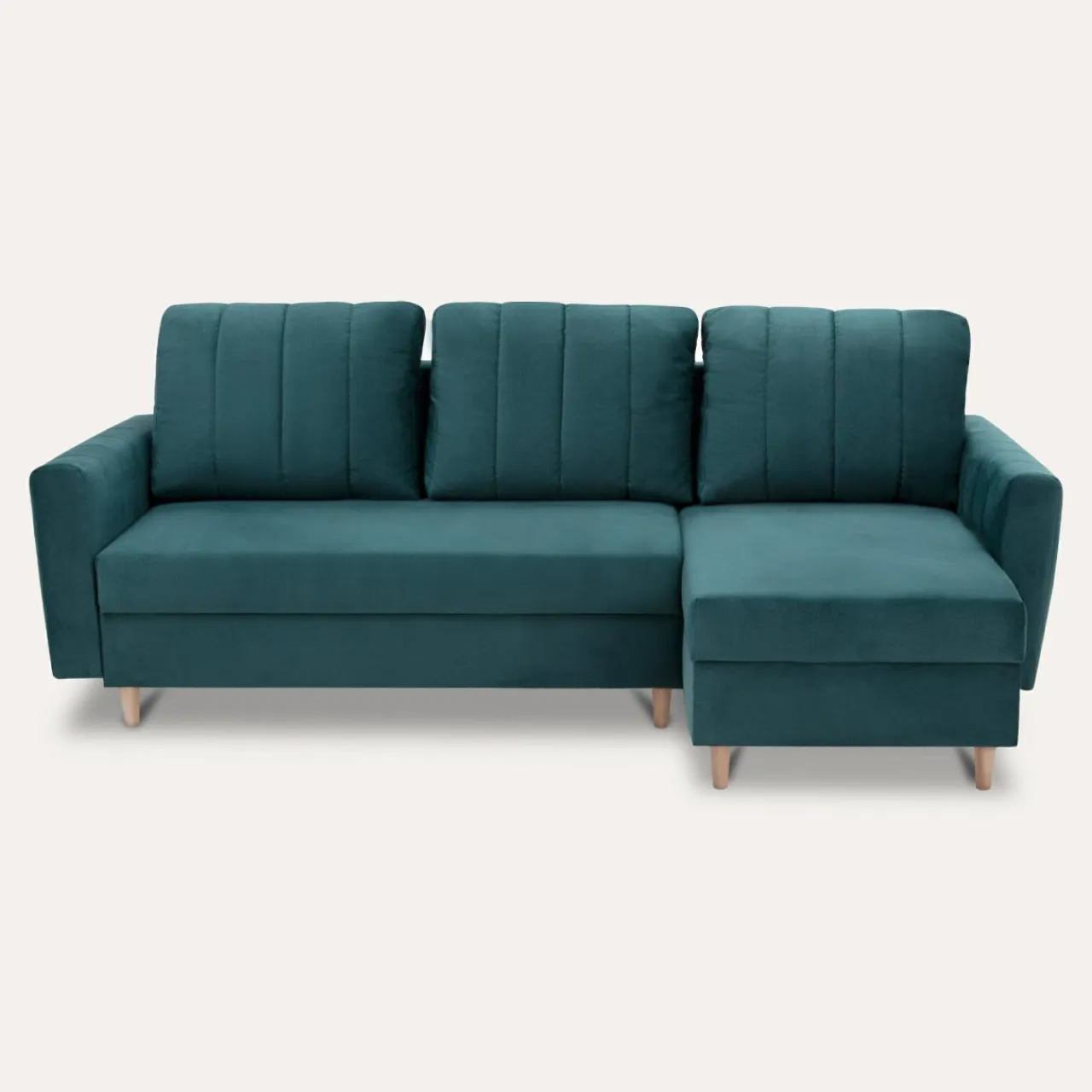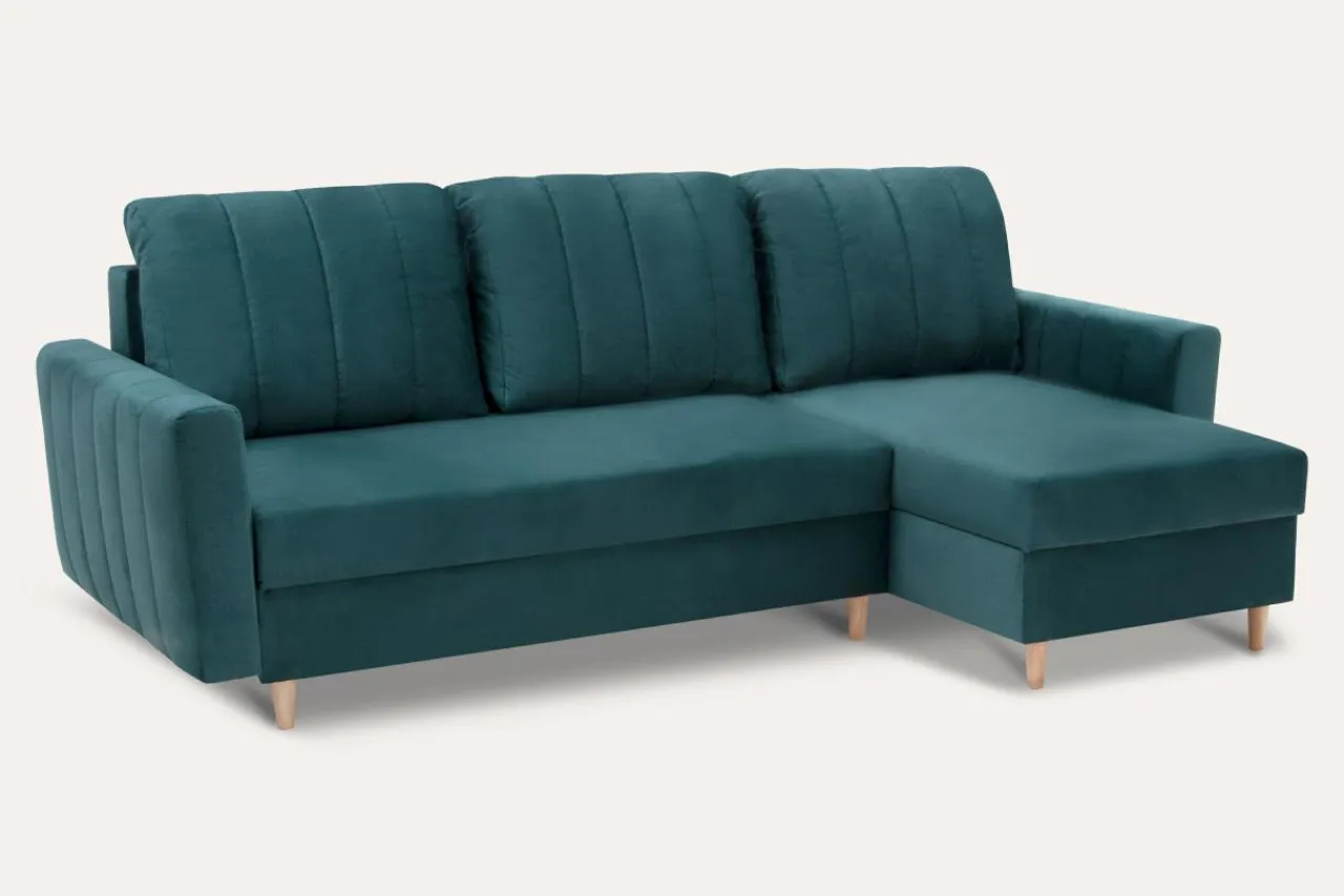 Narożnik w odcieniu koloru zielonego pomoże stworzyć elegancki i reprezentacyjny kącik wypoczynkowy.