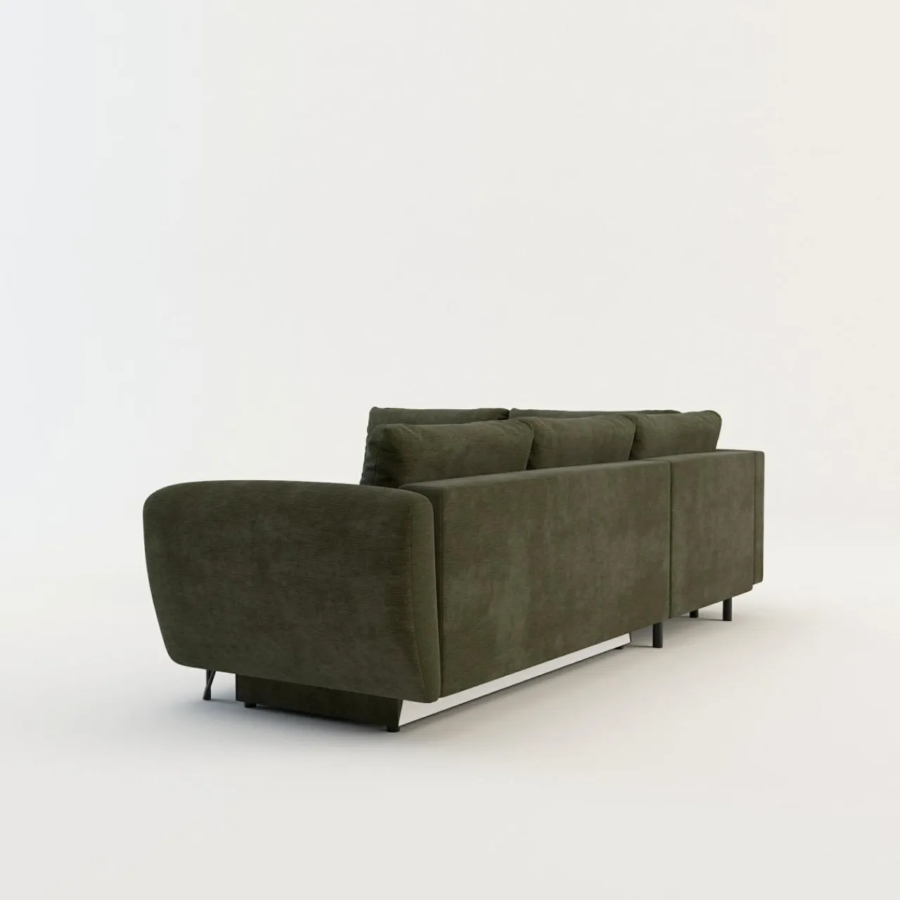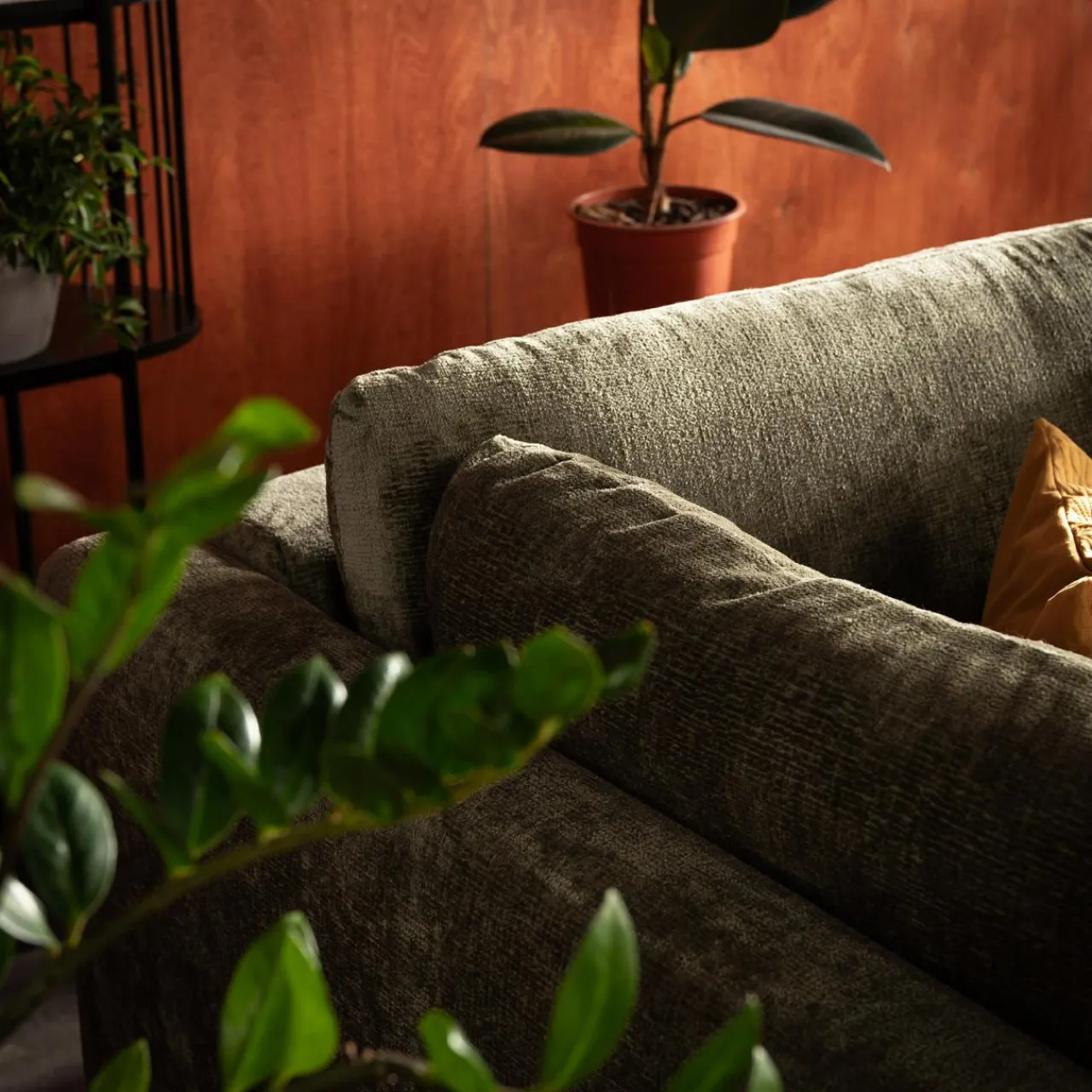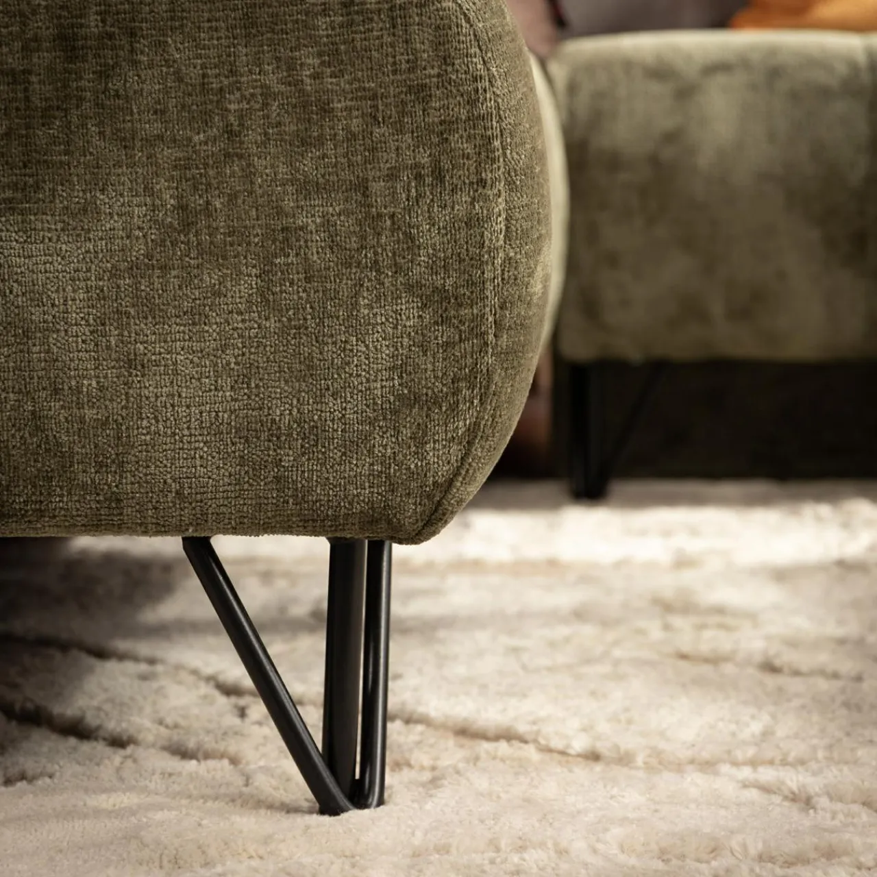 - Oliwkowa tkanina i czarne nóżki będą pasować zarówno do surowego, industrialnego wnętrza, jak i pełnej zieleni przestrzeni w stylu urban jungle.