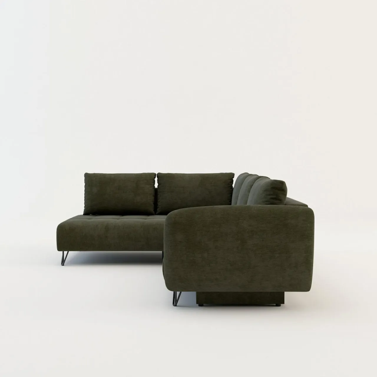 - W pojemniku pod siedziskiem wygodnie przechowasz pościel, koce lub inne domowe tekstylia. Dostęp do niego uzyskasz podczas rozkładania narożnika.