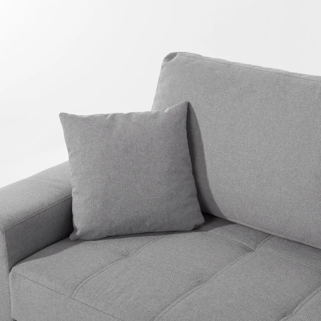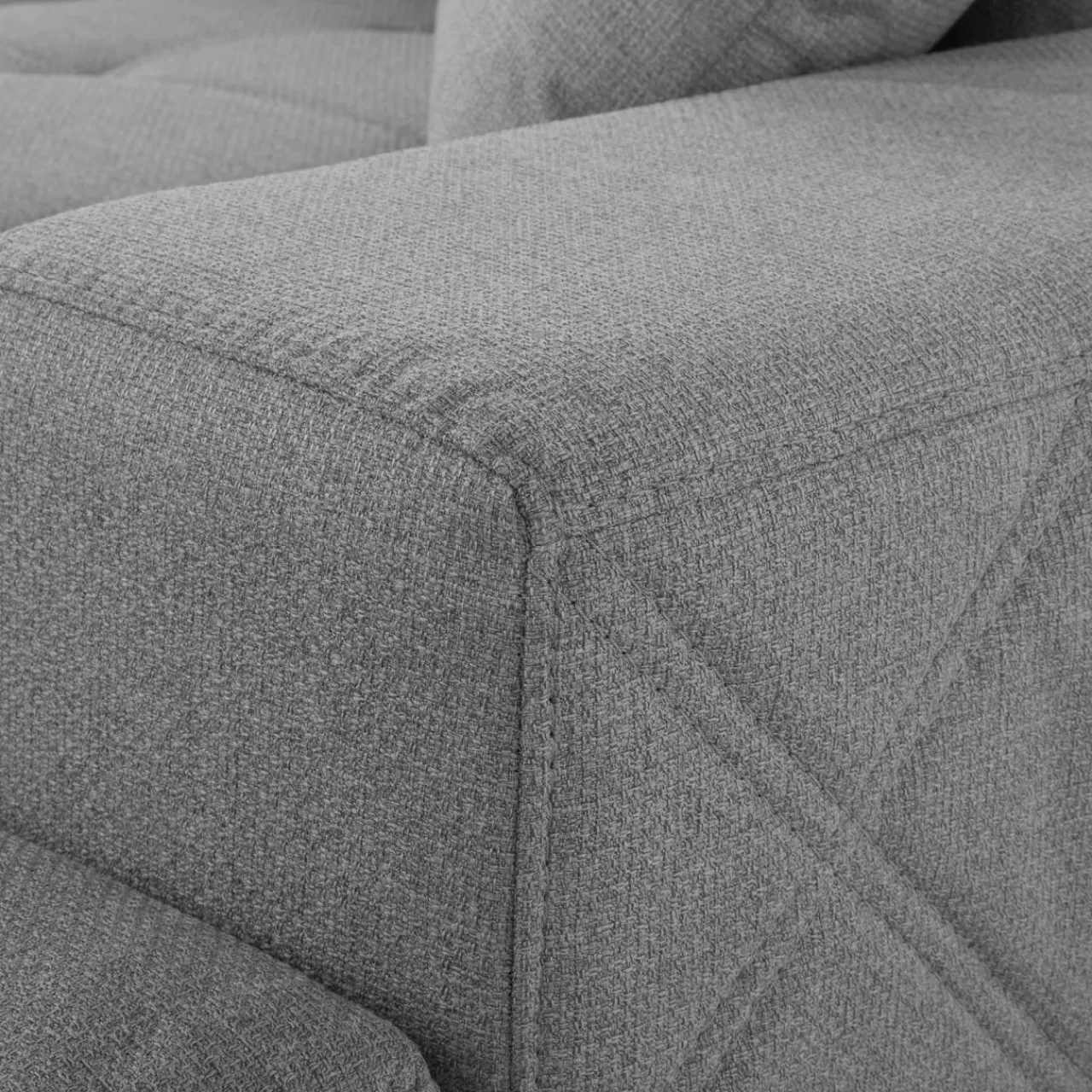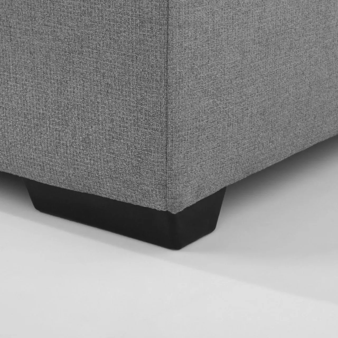 - Narożnik pokryto plecionką BARREL. Materiał cechuje się przeplataniem nitek w jasnym i ciemnym odcieniu szarości, co daje ciekawy efekt głębi.