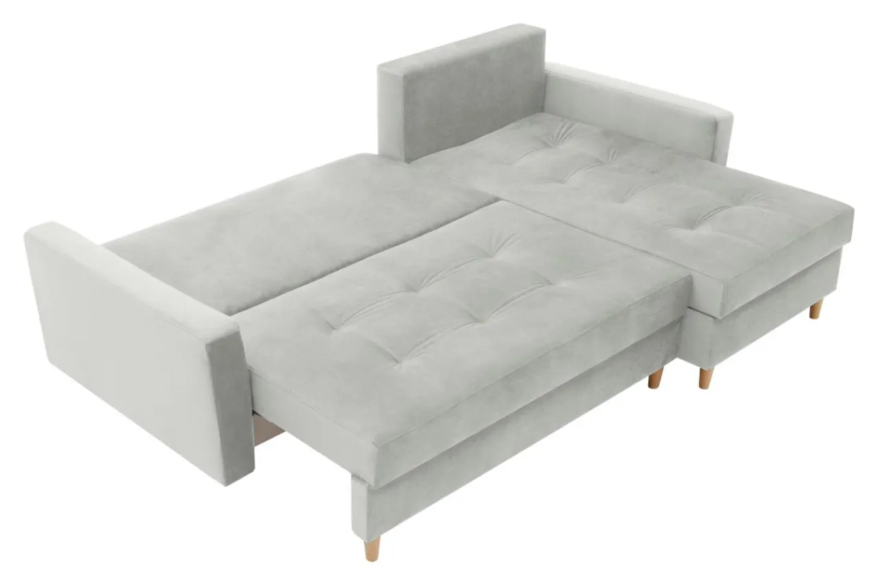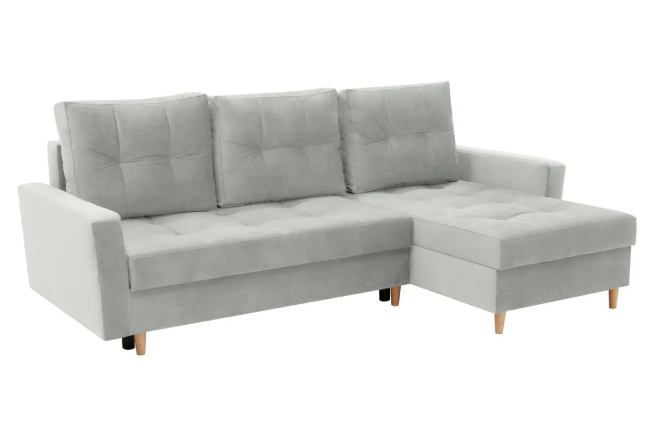 - Szary kolor i drewniane nóżki sprawiają, że narożnik pięknie będzie komponował się w pomieszczeniach w stylu skandynawskim.