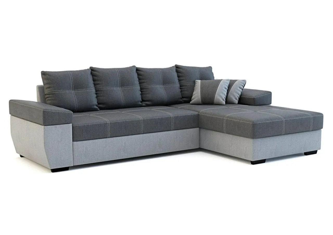 Rozłożysty narożnik LARGO to dobry wybór do obszernego salonu. Nowoczesny styl mebla i ciekawe kontrastowe przeszycia pozwolą każdego dnia cieszyć się wspaniałym wnętrzem i sprawić, że mebel będzie zwracał na siebie uwagę. Tapicerka w ciemnej i jasnej szarości z kontrastowymi nićmi na siedzisku i poduszkach oraz dwoma poduszkami dekoracyjnymi to charakterystyczna cecha tego modelu.