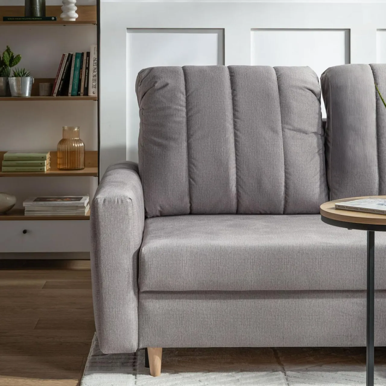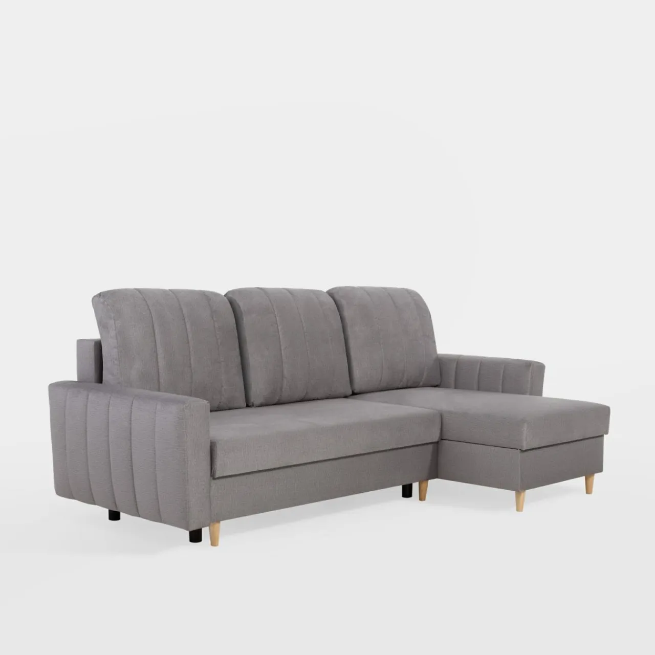Narożnik MASIMO pokryto tkaniną w drobną, szarą plecionkę. Przyjemny w dotyku materiał, umili popołudniowy wypoczynek w salonie.