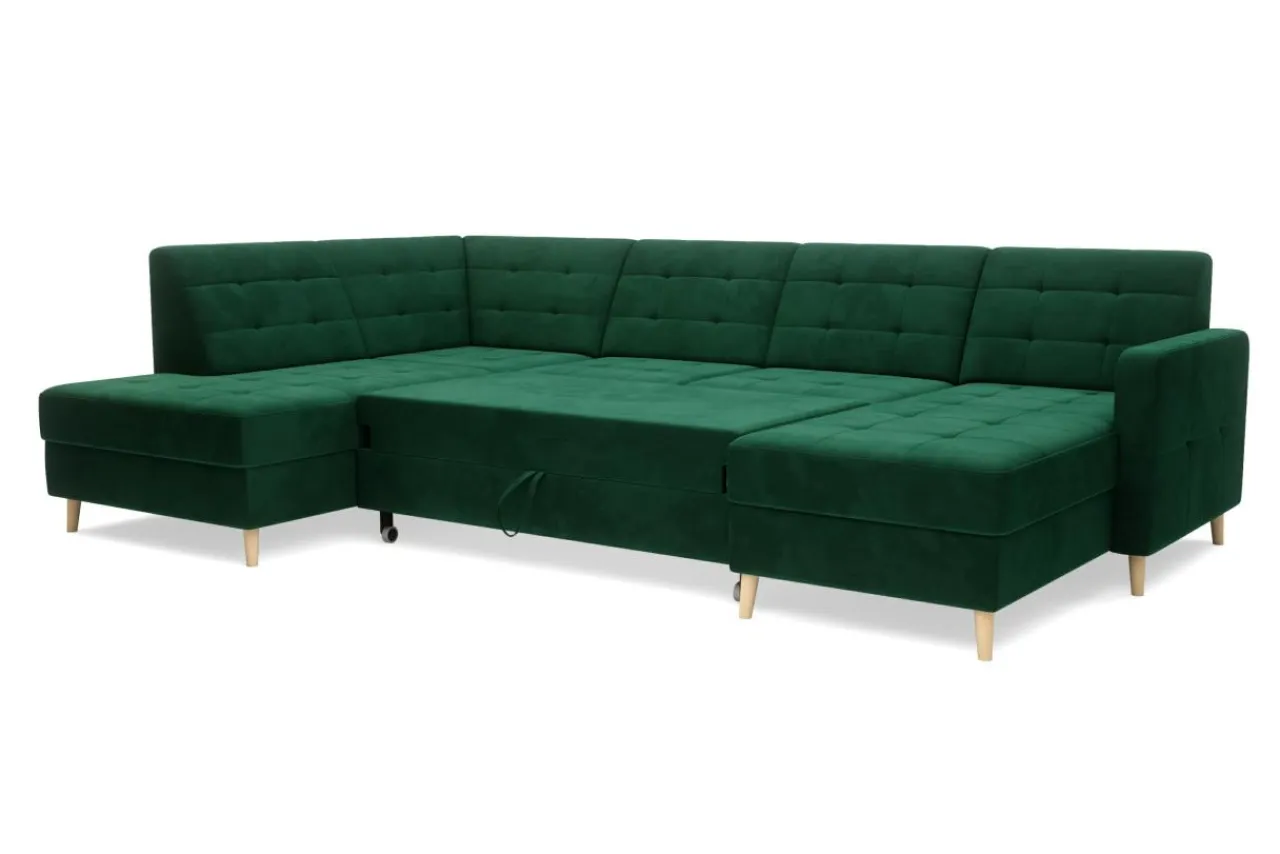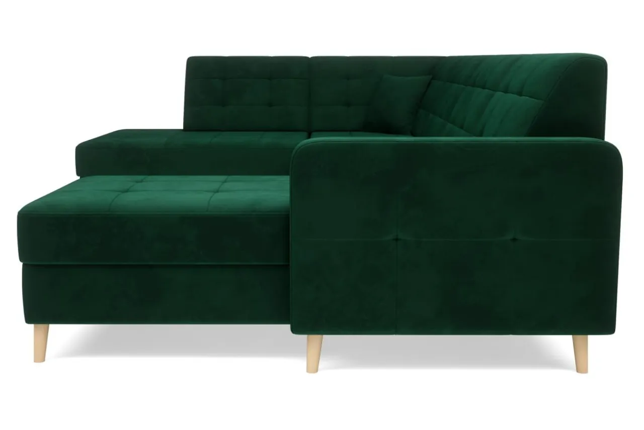 Welurowa tkanina RIVIERA użyta do obicia mebla jest bardzo przyjemna w dotyku i mało podatna na ścieranie. Wysokie nóżki wykonane są z bukowego drewna zabezpieczonego lakierem.