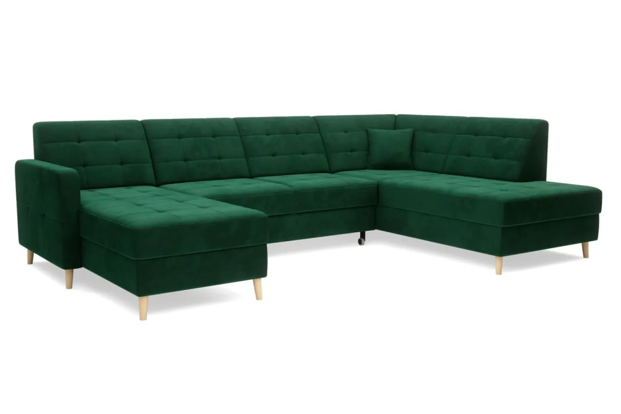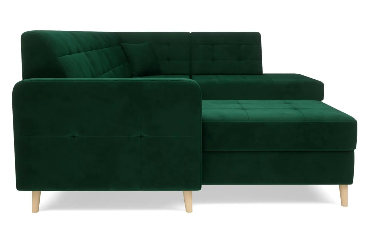 Welurowa tkanina RIVIERA użyta do obicia mebla jest bardzo przyjemna w dotyku i mało podatna na ścieranie. Wysokie nóżki wykonane są z bukowego drewna zabezpieczonego lakierem.