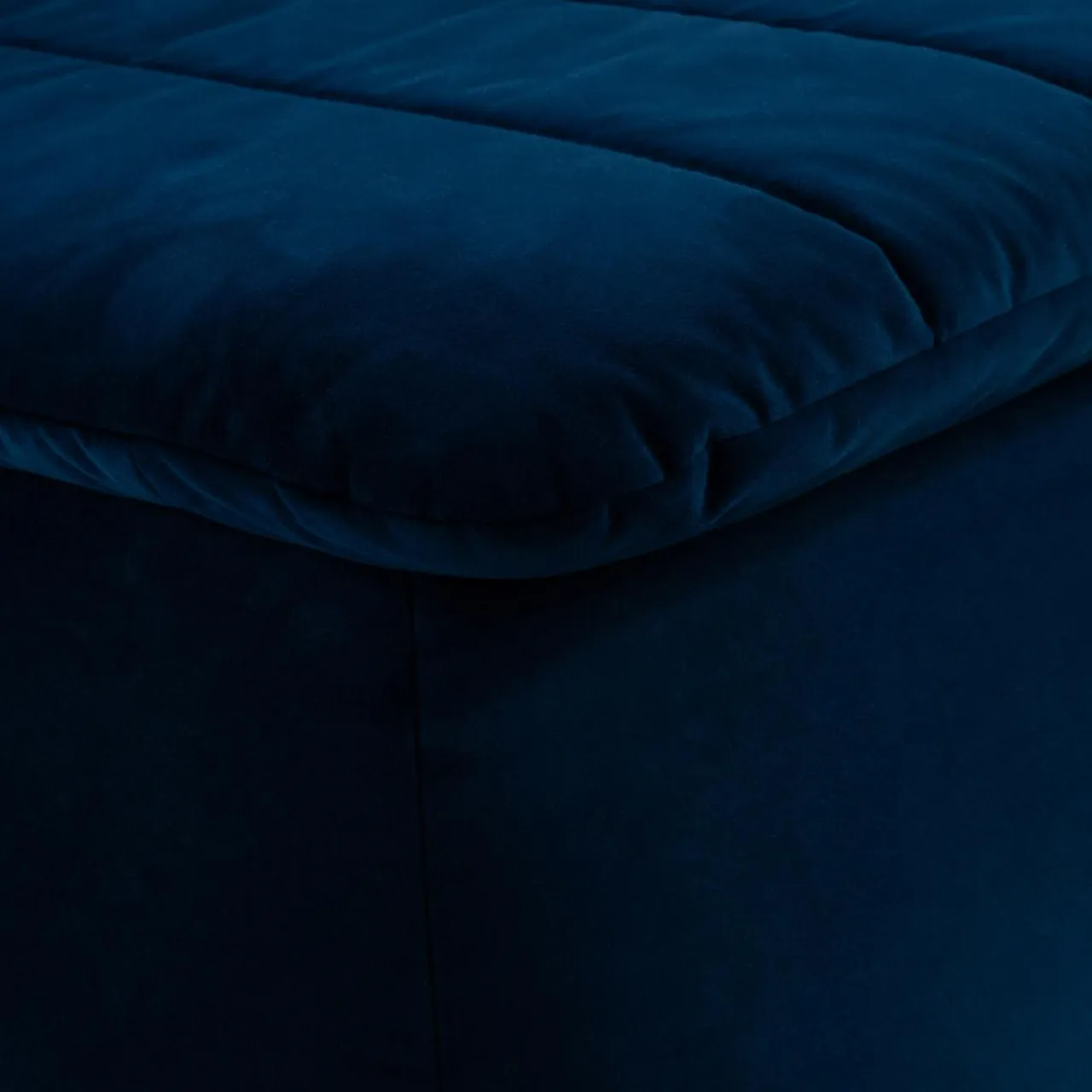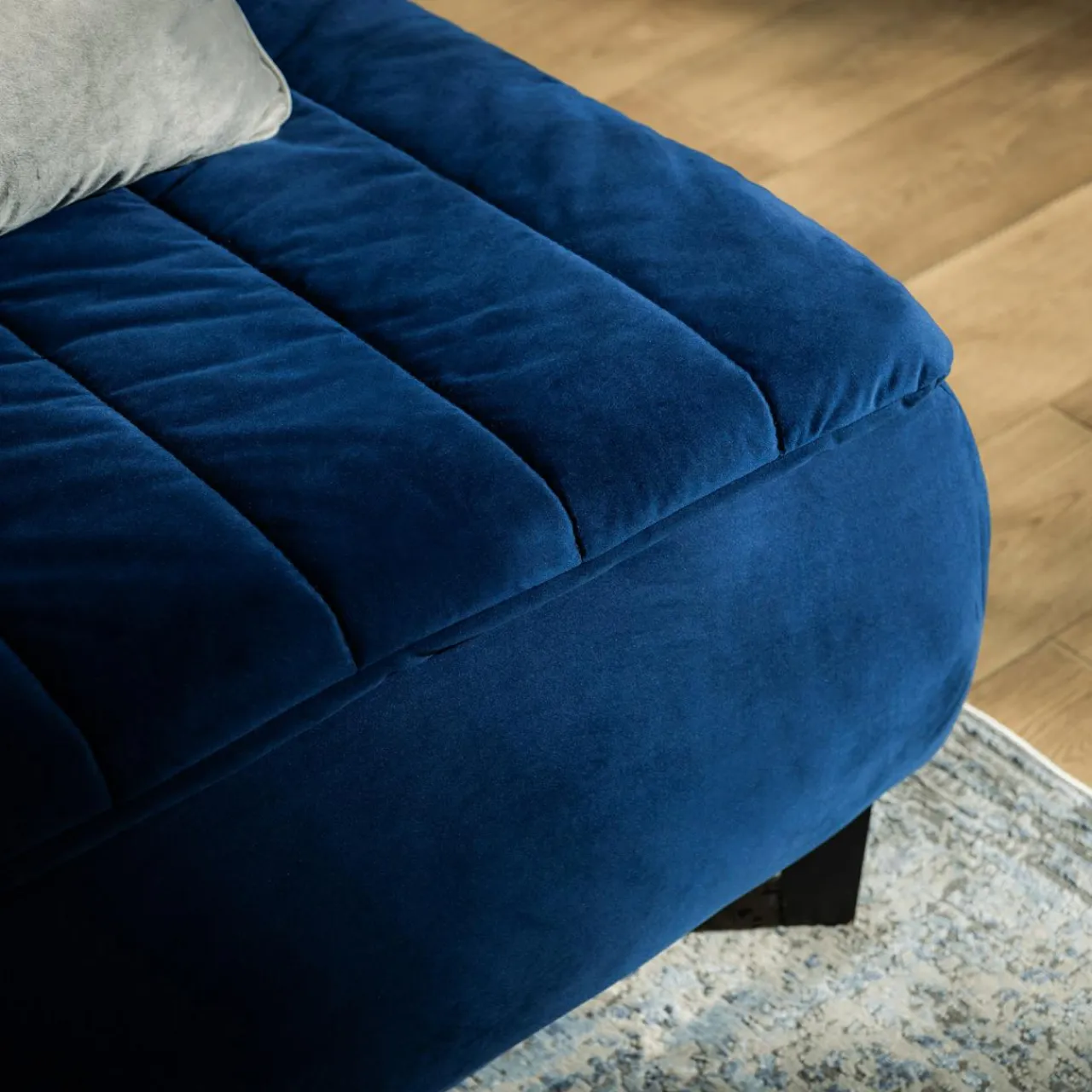 Sofa zachwyca welurową tkaniną o pięknym, granatowym odcieniu, która doskonale wpisuje się w najnowsze trendy wnętrzarskie. Elementem dekoracyjnym są pionowe przeszycia, które w elegancki sposób podkreślają nowoczesny charakter mebla. Możesz wkomponować ją we wnętrza z motywem morskiej głębi. Połyskująca powierzchnia tapicerki koresponduje z dodatkami w stylu glamour.