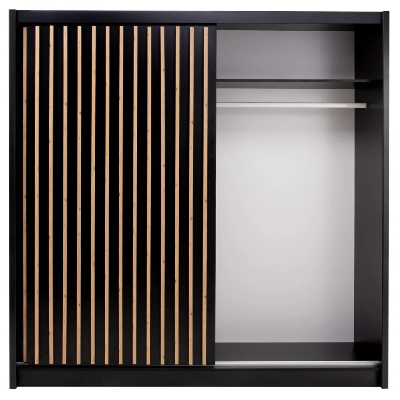 - Front stanowi czarna laminowana płyta ozdobiona lamelami w kolorze drewna. Lamele oprócz funkcji ozdobnej pełnią również rolę uchwytów. Wystarczy, że złapiesz za listwę i przesuniesz drzwi.