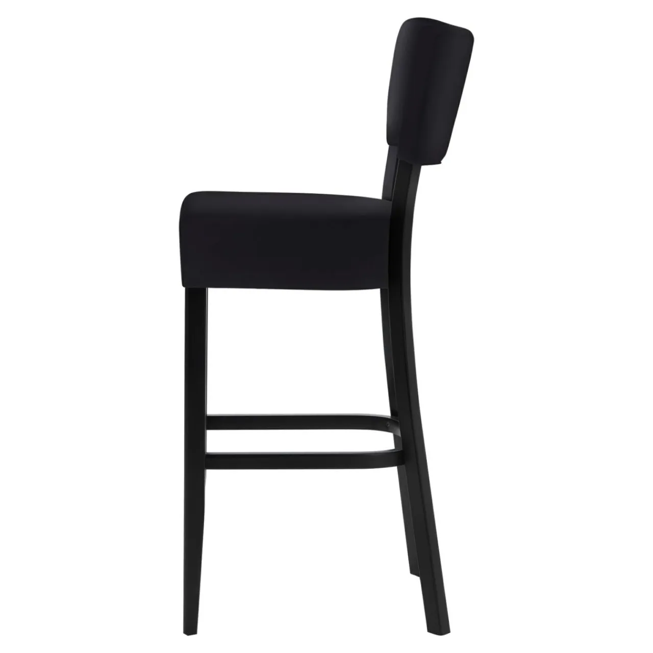 Krzesło barowe RYAN ma czarną podstawę, a siedzisko i oparcie pokryte czarną tkaniną. Będzie się prezentować stylowo w każdym wnętrzu.