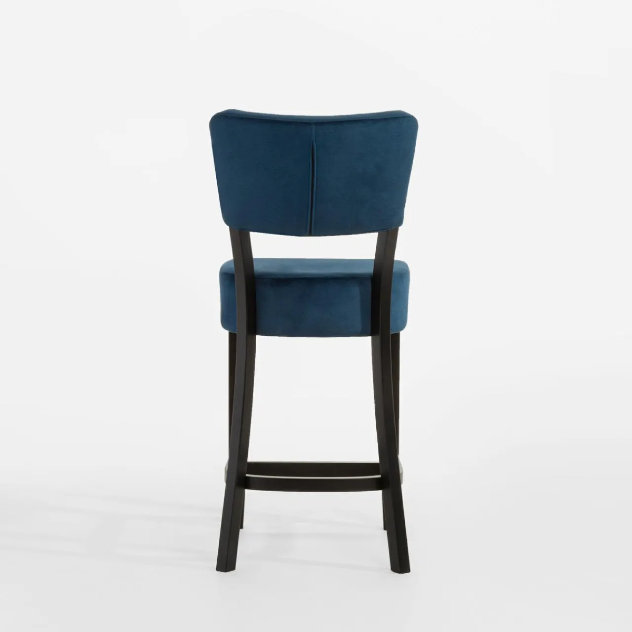 Tapicerowane krzesło barowe sprawi, że strefa z wyspą kuchenną nabierze luksusowego charakteru. Połączenie granatowego weluru z czarnymi nogami z drewna bukowego wygląda bardzo elegancko.