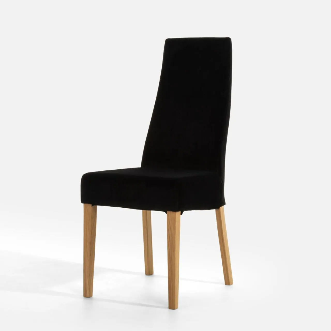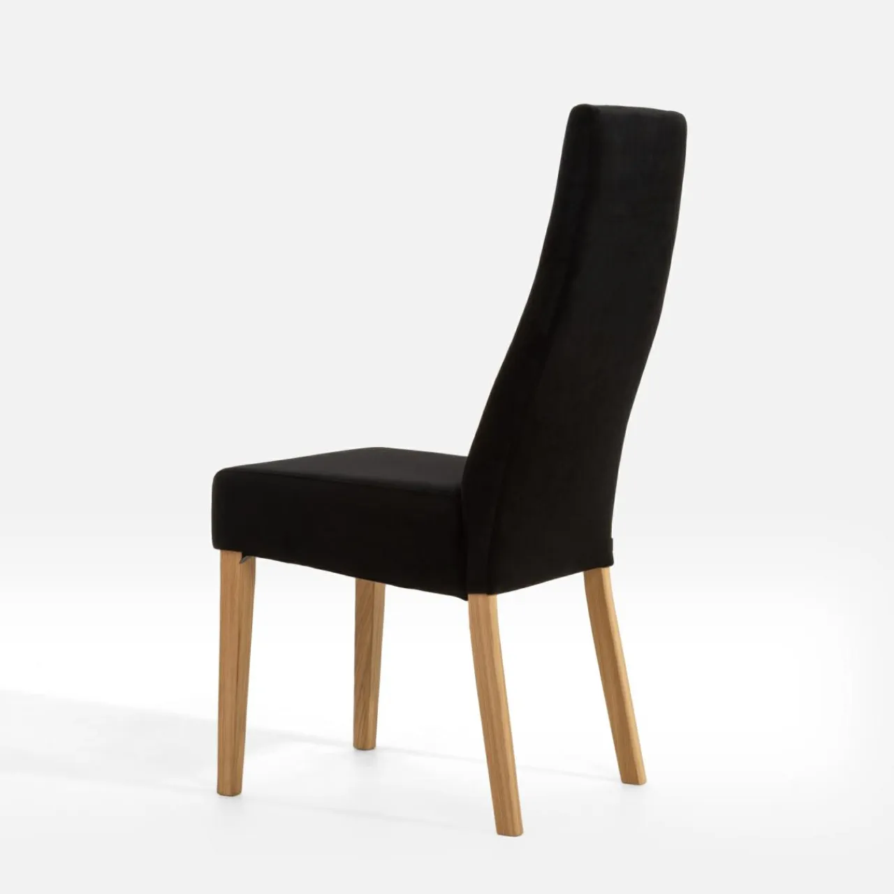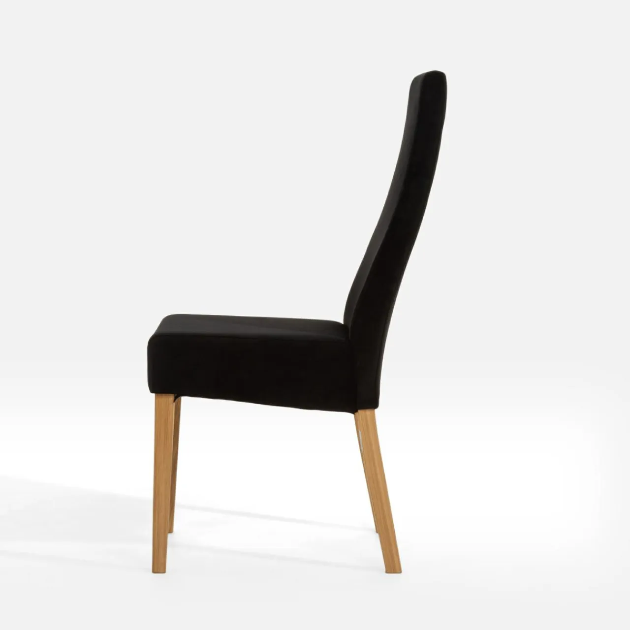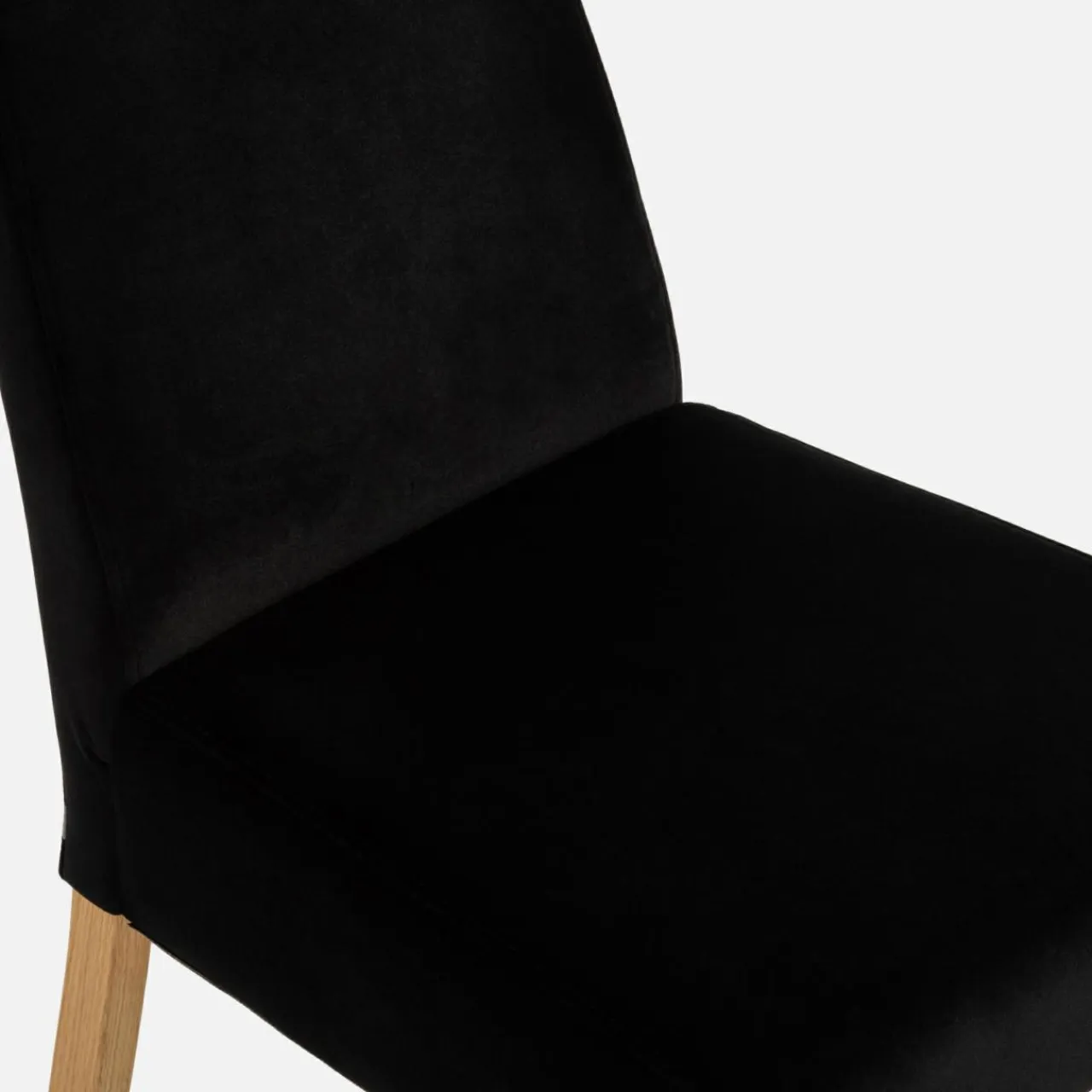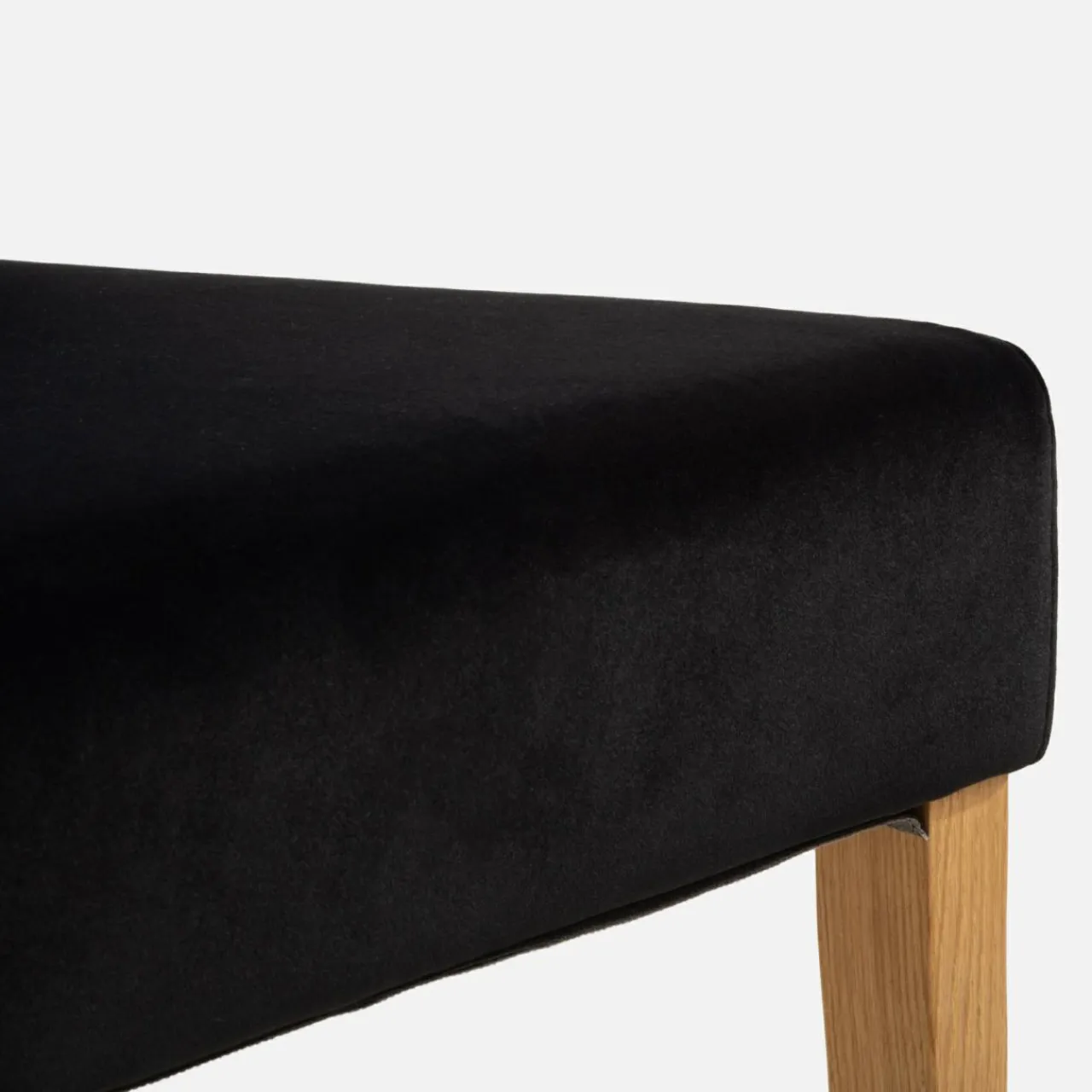Czarny, miękki welur połączony z jasnym drewnem dębowym bez problemu dopasujesz do większości nowoczesnych pomieszczeń.