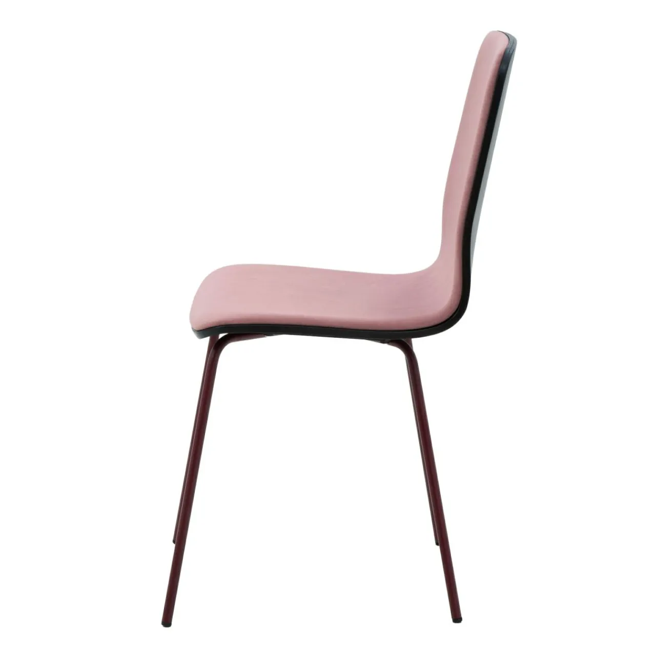 - Podstawę krzesła stanowią metalowe nogi w bordowym kolorze.