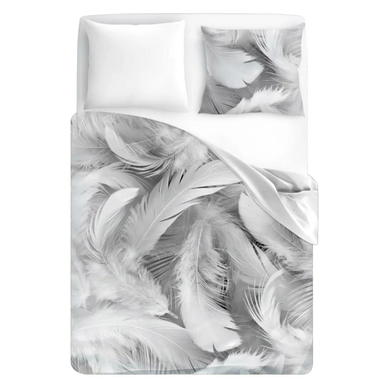 Wzór białych piórek na szarym tle sprawdzi się, jeśli pragniesz wprowadzić styl boho do swojej sypialni.