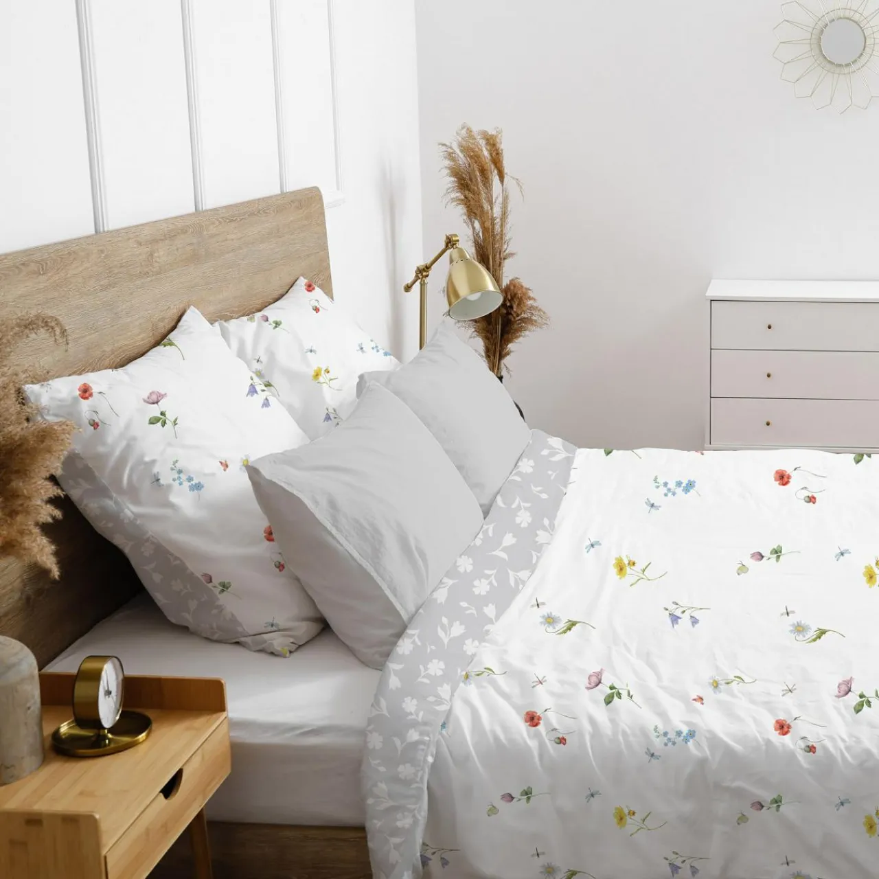 - Delikatny wzór w polne kwiaty pasować będzie do sypialni w naturalnym stylu. Postaw na dodatki z rattanu i drewna, a osiągniesz spójne wizualnie wnętrze.