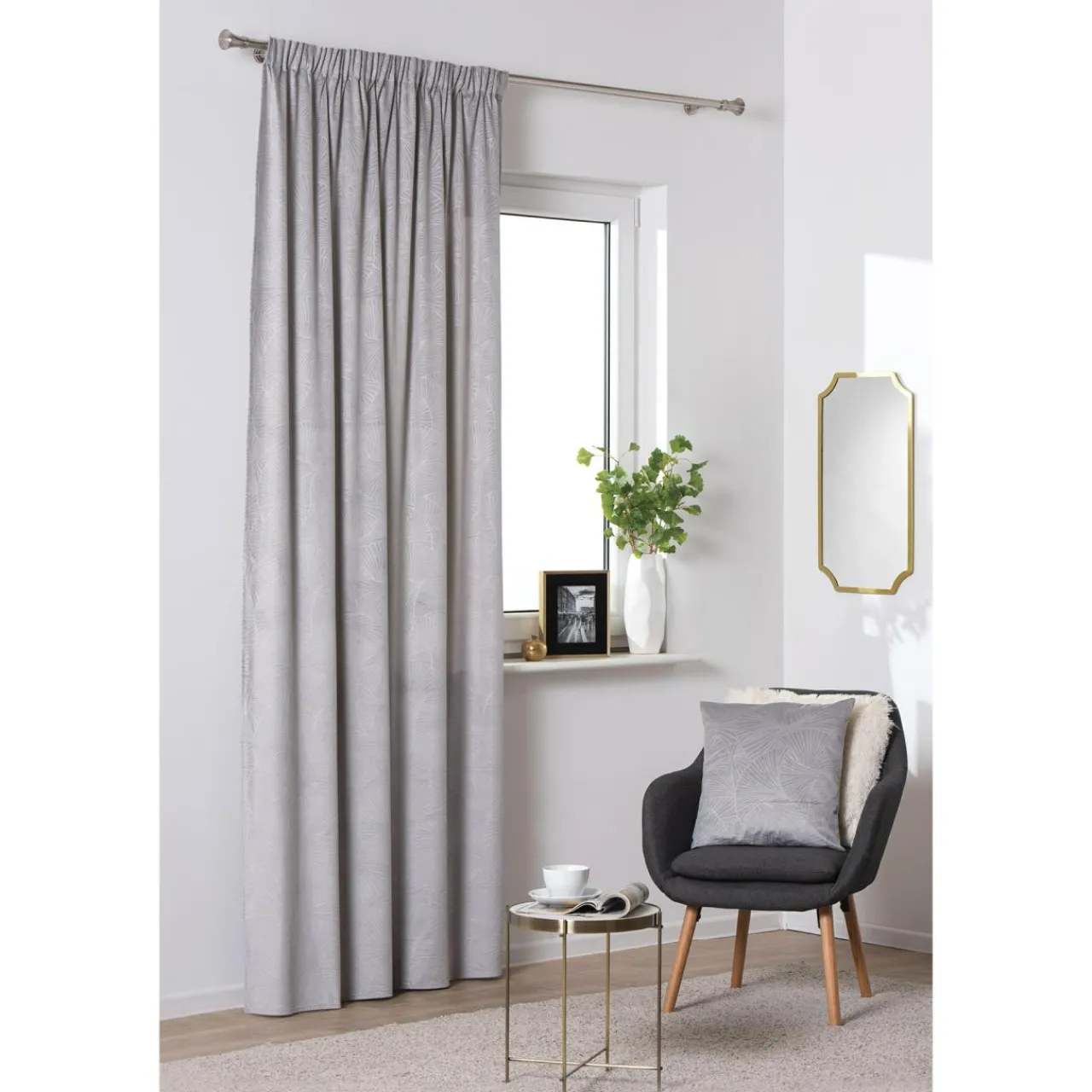 - Gładkie, jasne ściany w połączeniu z zasłoną BILO w liście miłorzębu stworzą modną aranżację. Roślinny wzór uatrakcyjni wnętrze.