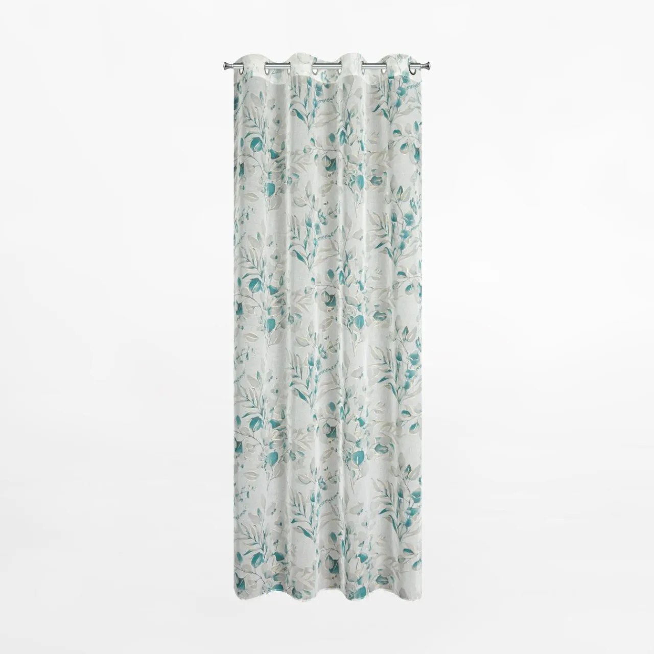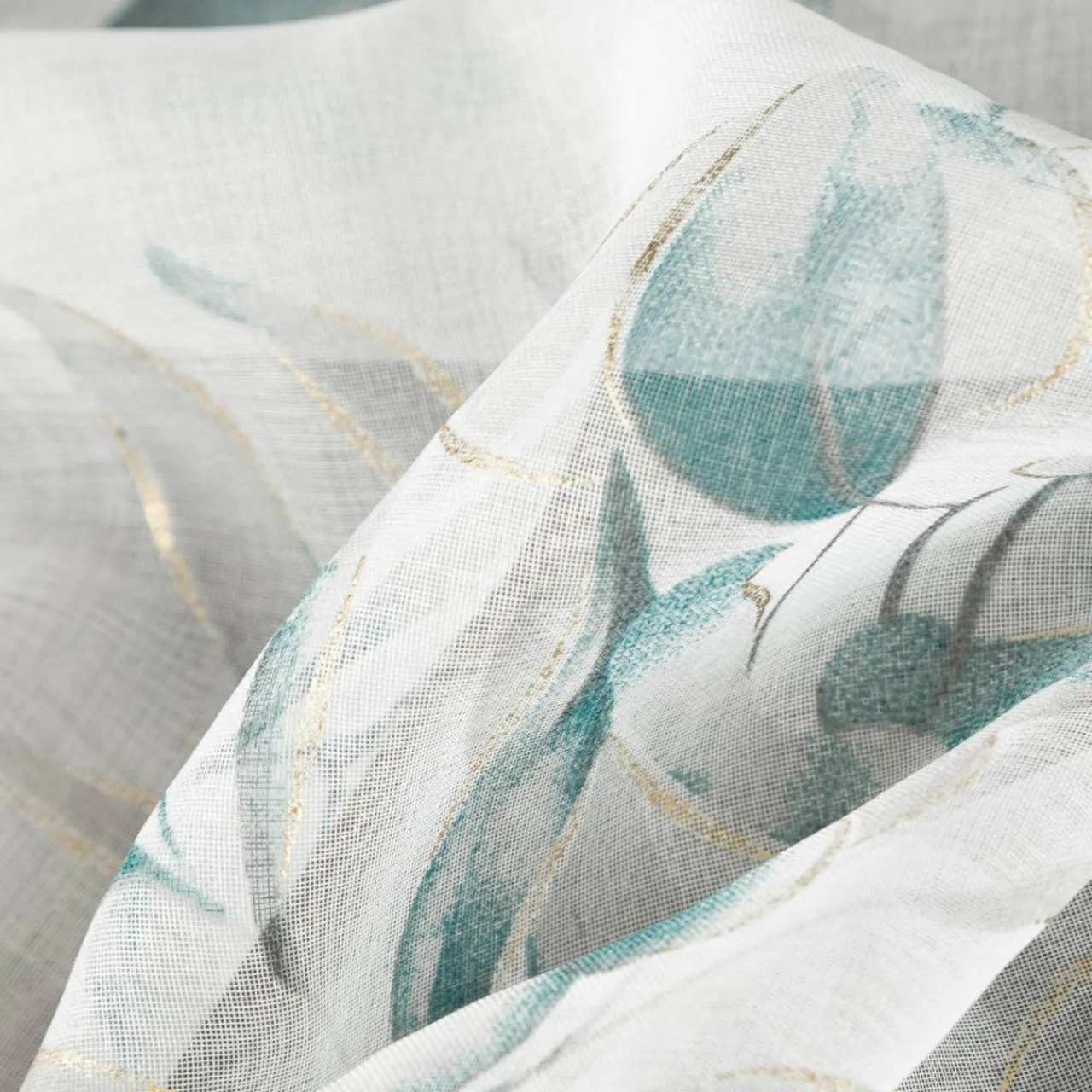 Zwiewna zasłona na przelotkach AVA z motywem liści muśniętych szampańskim złotem dopełni aranżację w stylu glamour.