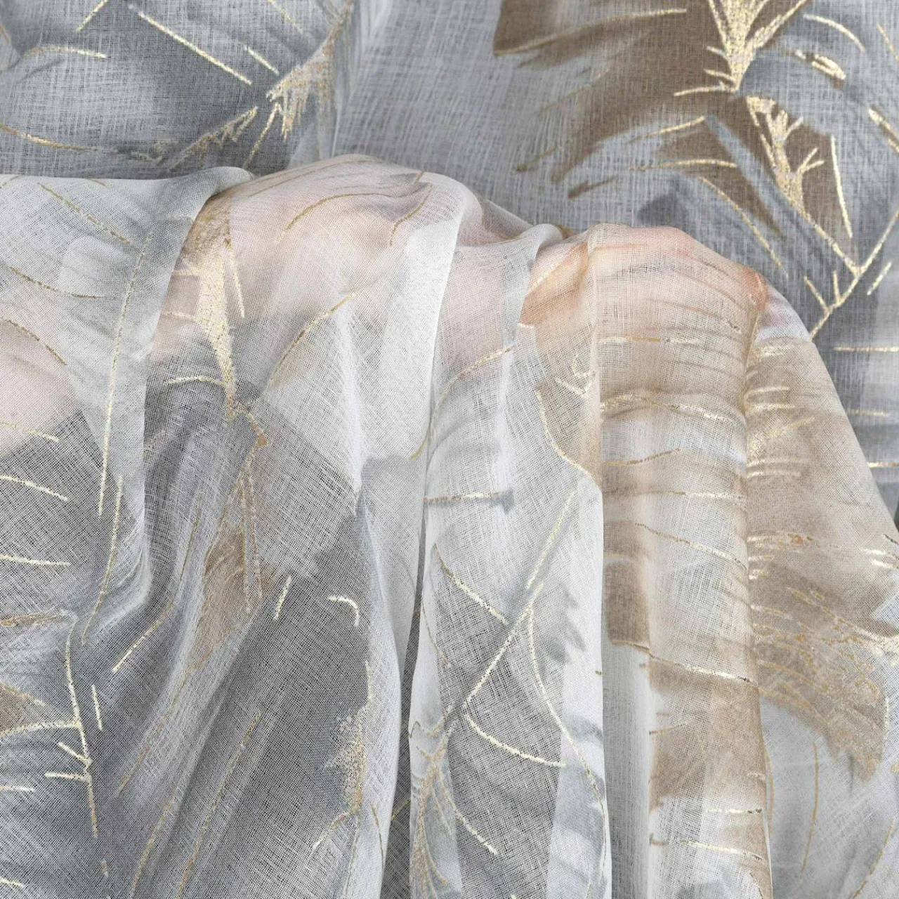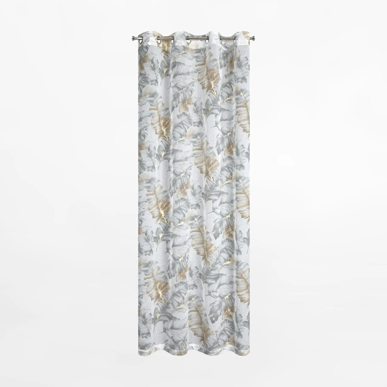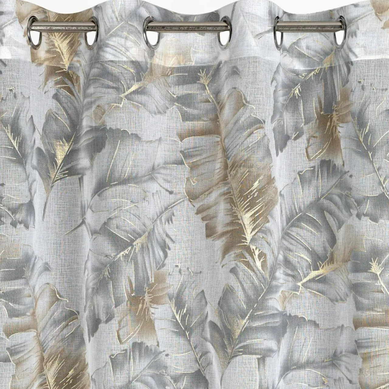 Srebrno-szara zasłona na przelotkach LAYLA w egzotyczne liście lekko się mieni, dzięki czemu zyskuje elegancki akcent.