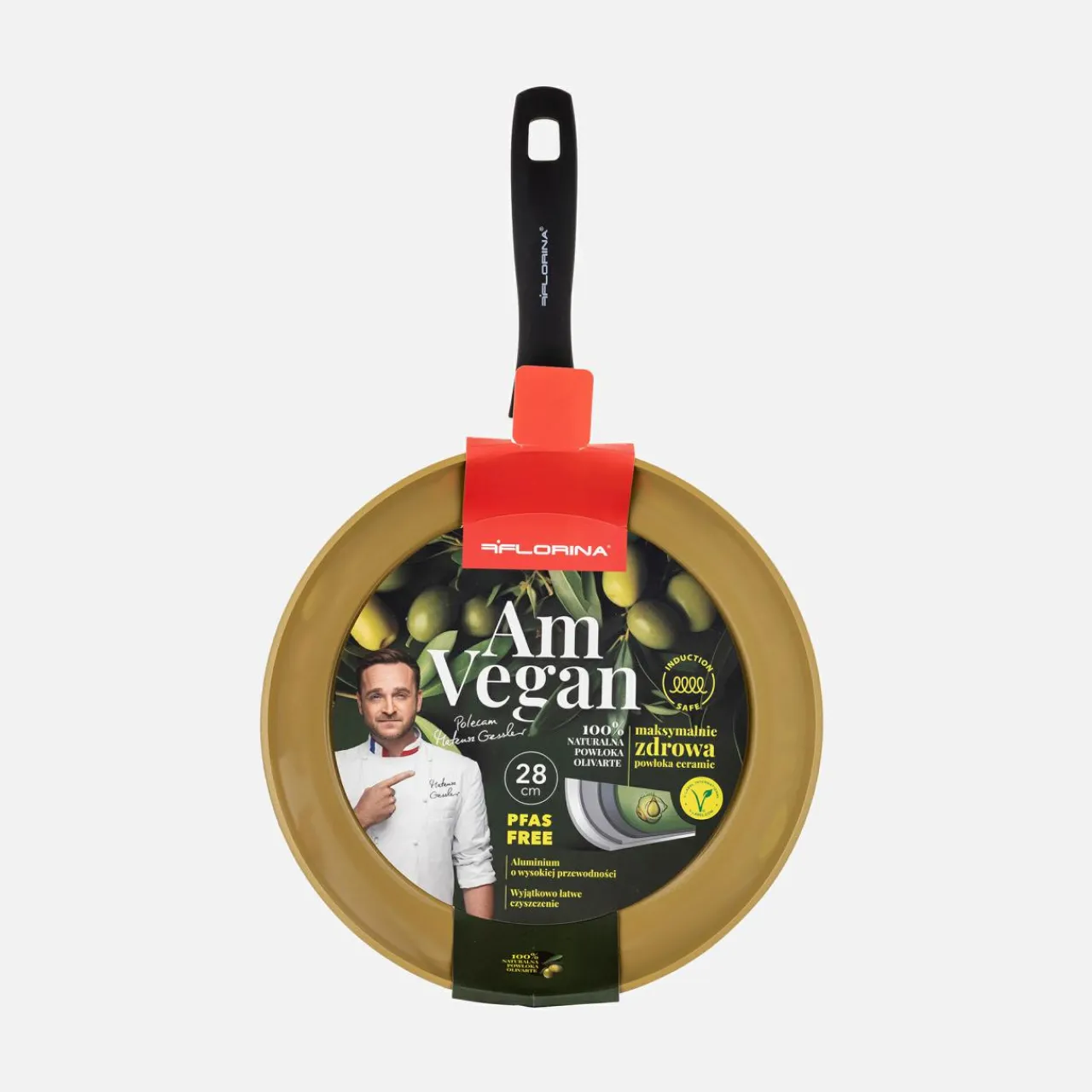 Patelnia AmVegan o średnicy 28 cm jest wykonana z lekkiego aluminium – naczynie posiada nieprzywierającą powłokę ceramiczną o oliwkowym kolorze – posiłki nabiorą smaku i staną się zdrowsze. Usmażysz mięso i warzywa na mniejszej ilości tłuszczu.